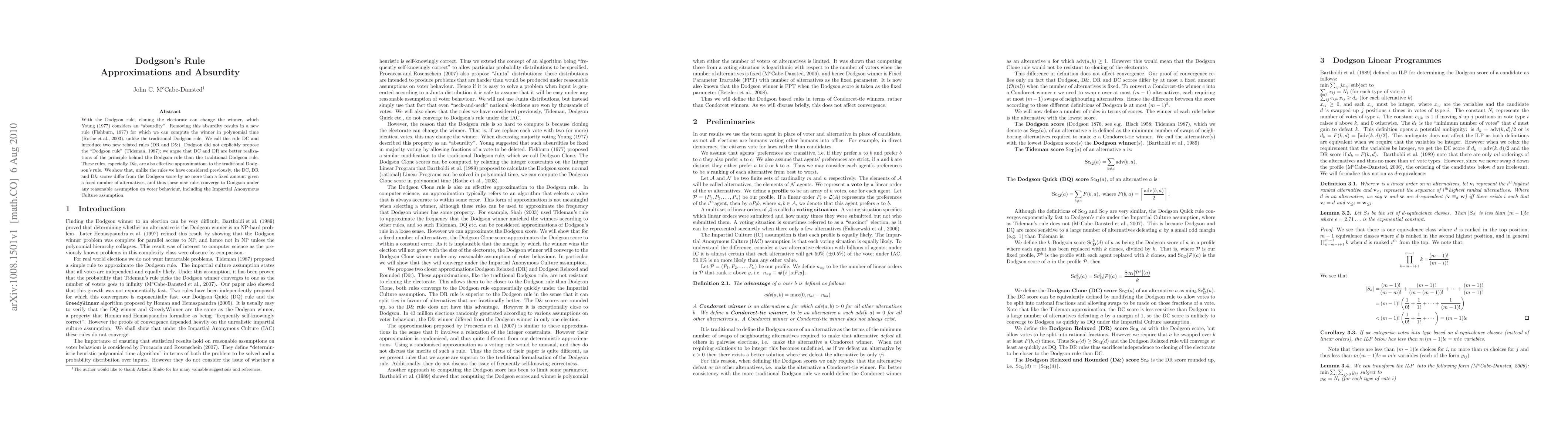 Researchers introduce new voting rules (DC, DR, D&) that accurately approximate the Dodgson rule, which can alter election outcomes, in polynomial time, resolving a long-standing 'absurdity'. These rules converge to the Dodgson score under reasonable assumptions on voter behavior.