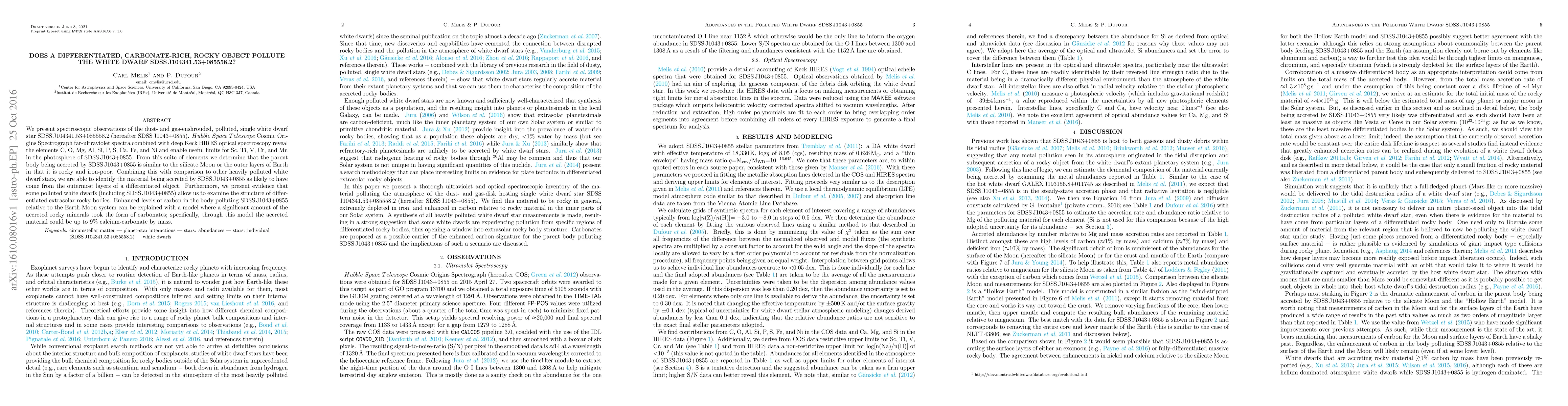 The paper presents a detailed elemental abundance analysis of a heavily polluted white dwarf, SDSSJ1043+0855, and proposes a model for the origin and composition of the accreted material.