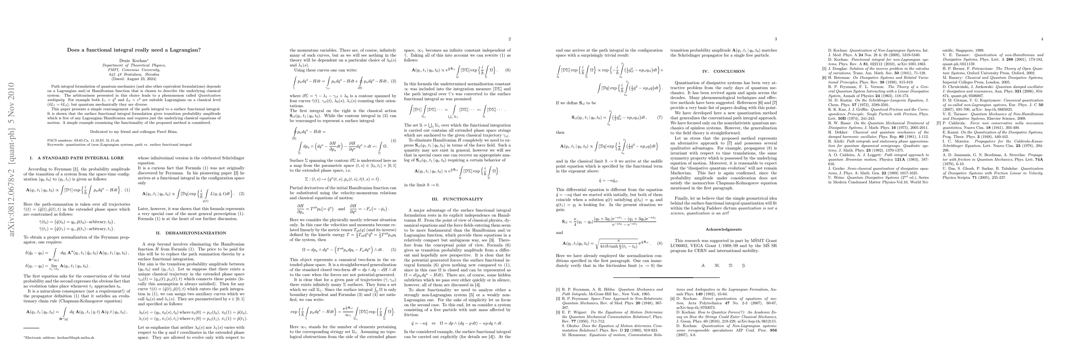 Path integral formulation of quantum mechanics (and also other equivalent formulations) depends on a Lagrangian and/or Hamiltonian function that is chosen to describe the underlying classical system. The arbitrariness presented in this choice leads to a phenomenon called Quantization ambiguity. For example both $L_1=\dot{q}^2$ and $L_2=e^\dot{q}$ are suitable Lagrangians on a classical level ($\delta L_1=0=\delta L_2$), but quantum mechanically they are diverse. This paper presents a simple rearrangement of the path integral to a surface functional integral. It is shown that the surface functional integral formulation gives transition probability amplitude which is free of any Lagrangian/Hamiltonian and requires just the underlying classical equations of motion. A simple example examining the functionality of the proposed method is considered.