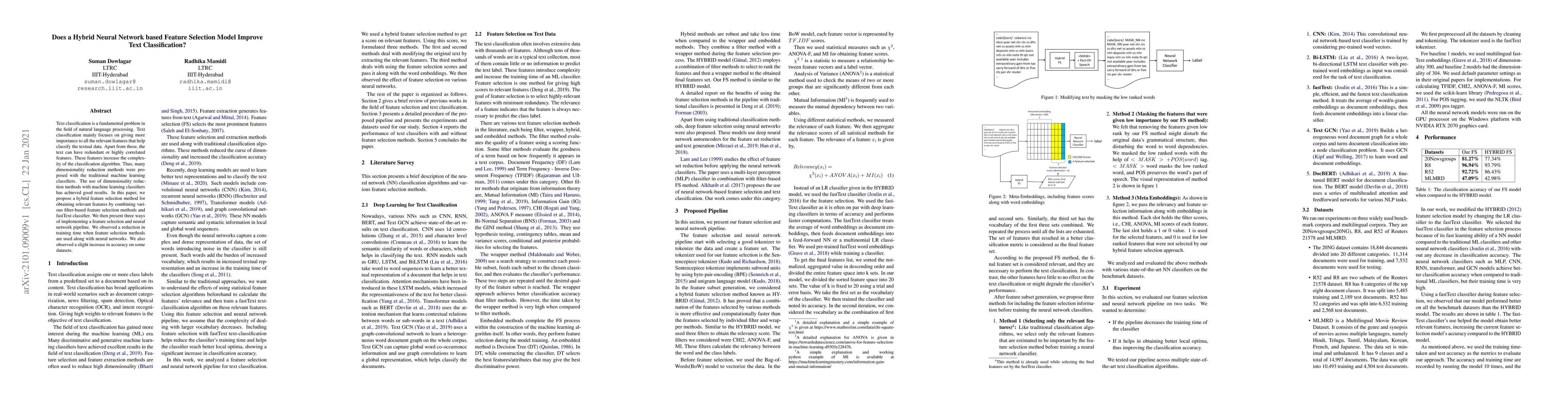 Text classification is a fundamental problem in the field of natural language processing. Text classification mainly focuses on giving more importance to all the relevant features that help classify the textual data. Apart from these, the text can have redundant or highly correlated features. These features increase the complexity of the classification algorithm. Thus, many dimensionality reduction methods were proposed with the traditional machine learning classifiers. The use of dimensionality reduction methods with machine learning classifiers has achieved good results. In this paper, we propose a hybrid feature selection method for obtaining relevant features by combining various filter-based feature selection methods and fastText classifier. We then present three ways of implementing a feature selection and neural network pipeline. We observed a reduction in training time when feature selection methods are used along with neural networks. We also observed a slight increase in accuracy on some datasets.