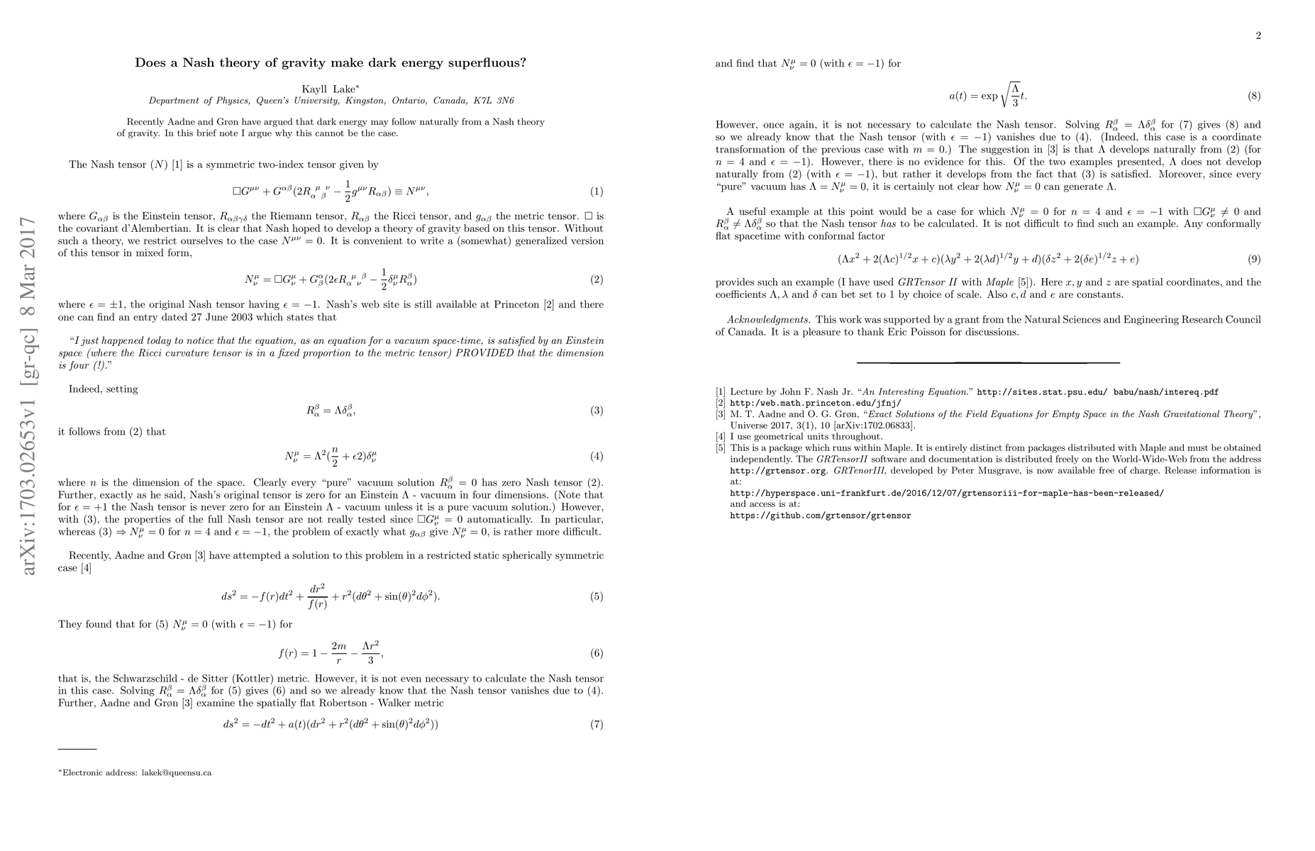 Recently Aadne and Gr{\o}n have argued that dark energy may follow naturally from a Nash theory of gravity. In this brief note I argue why this cannot be the case.