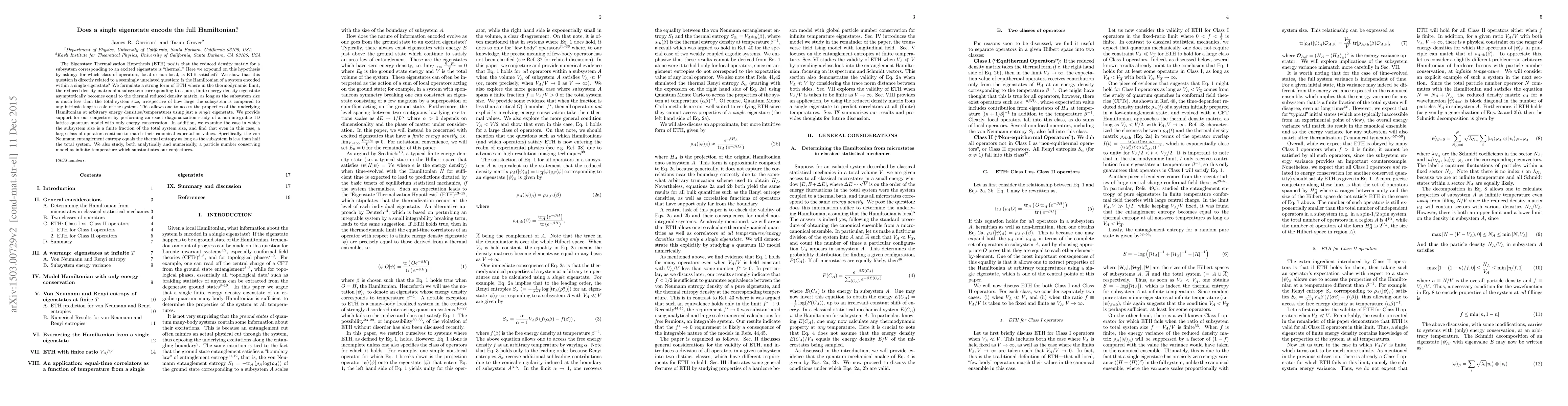 This paper explores the Eigenstate Thermalization Hypothesis (ETH) and investigates whether a single eigenstate can encode the full Hamiltonian of a system. The authors propose a strong form of ETH, demonstrating that in the thermodynamic limit, the reduced density matrix of a subsystem corresponding to a pure eigenstate can approximate the thermal reduced density matrix, allowing access to the Hamiltonian's properties using just one eigenstate. This is supported by exact diagonalization studies and analytical/numerical analyses of various quantum models.