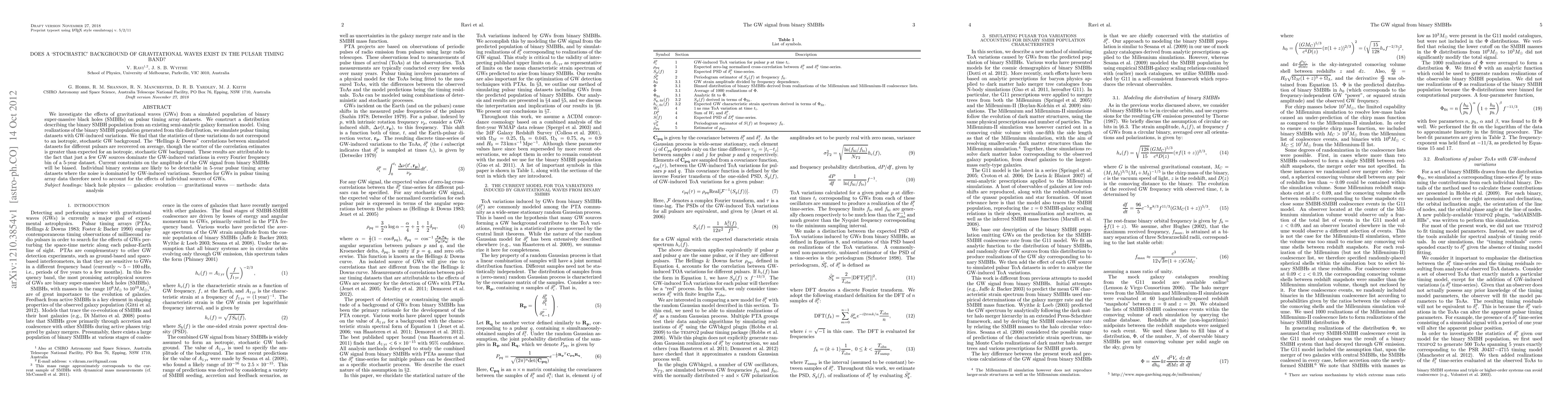 We investigate the effects of gravitational waves (GWs) from a simulated population of binary super-massive black holes (SMBHs) on pulsar timing array datasets. We construct a distribution describing the binary SMBH population from an existing semi-analytic galaxy formation model. Using realizations of the binary SMBH population generated from this distribution, we simulate pulsar timing datasets with GW-induced variations. We find that the statistics of these variations do not correspond to an isotropic, stochastic GW background. The "Hellings & Downs" correlations between simulated datasets for different pulsars are recovered on average, though the scatter of the correlation estimates is greater than expected for an isotropic, stochastic GW background. These results are attributable to the fact that just a few GW sources dominate the GW-induced variations in every Fourier frequency bin of a 5-year dataset. Current constraints on the amplitude of the GW signal from binary SMBHs will be biased. Individual binary systems are likely to be detectable in 5-year pulsar timing array datasets where the noise is dominated by GW-induced variations. Searches for GWs in pulsar timing array data therefore need to account for the effects of individual sources of GWs.