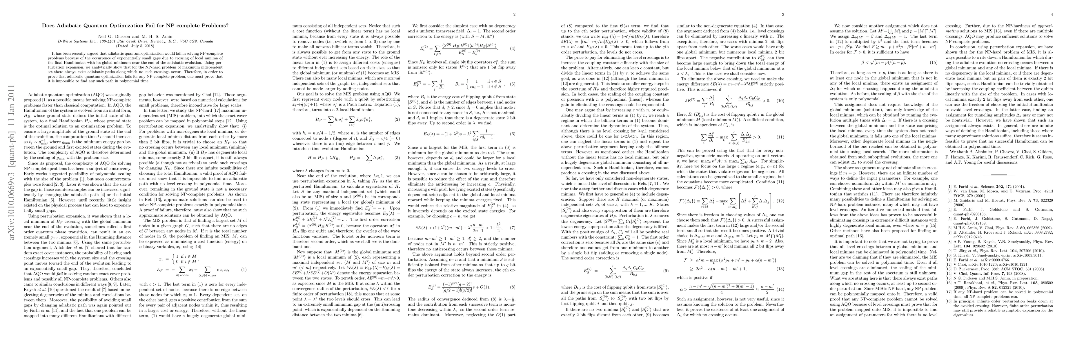 This research paper argues that adiabatic quantum optimization may not universally fail for NP-complete problems due to the presence of certain adiabatic paths that avoid problematic local minima crossings. It concludes that proving the universal failure of this method requires demonstrating the impossibility of finding such paths in polynomial time.