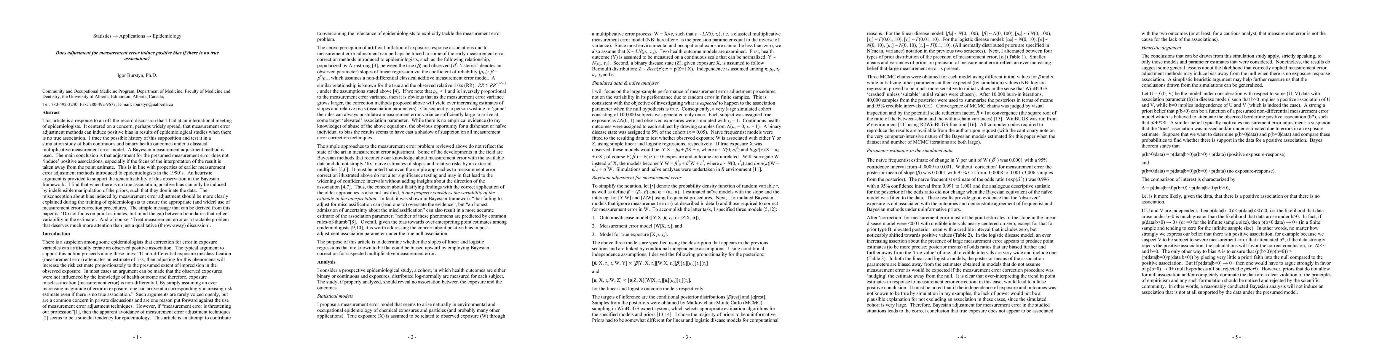 This paper investigates whether measurement error adjustment induces positive bias in the absence of true association, finding that it does not, especially when focusing on confidence intervals rather than point estimates. The study concludes that proper use of Bayesian measurement adjustment methods should alleviate misconceptions, emphasizing the importance of treating measurement error seriously in epidemiological research.