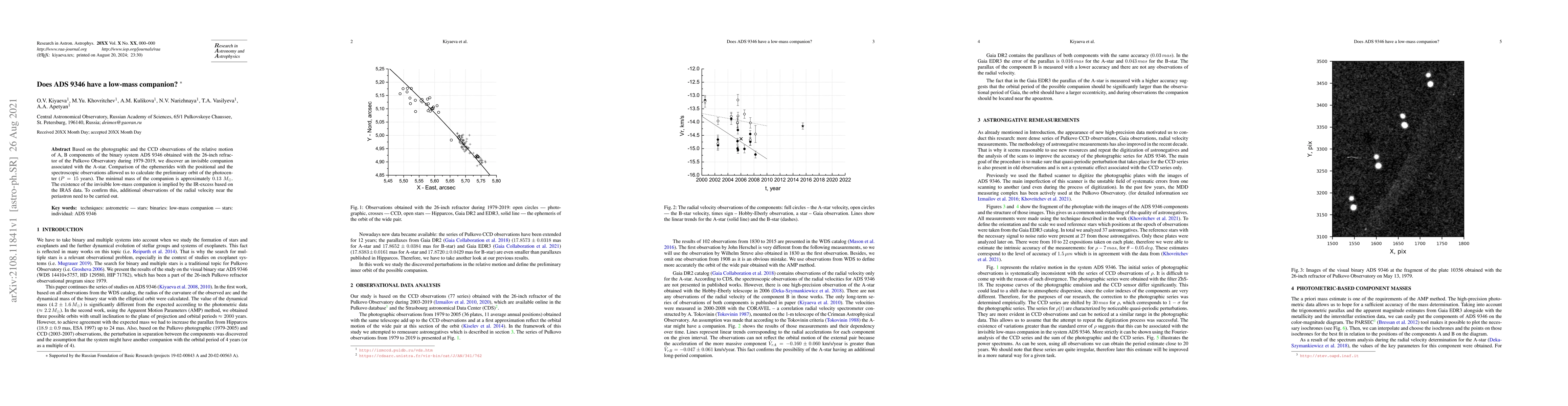 The study reveals an invisible low-mass companion to the A-star in the binary system ADS 9346, inferred from relative motion observations over 40 years. The companion's minimal mass is estimated at 0.13 solar masses, with additional IR-excess data suggesting its presence, though further radial velocity observations near periastron are needed for confirmation.
