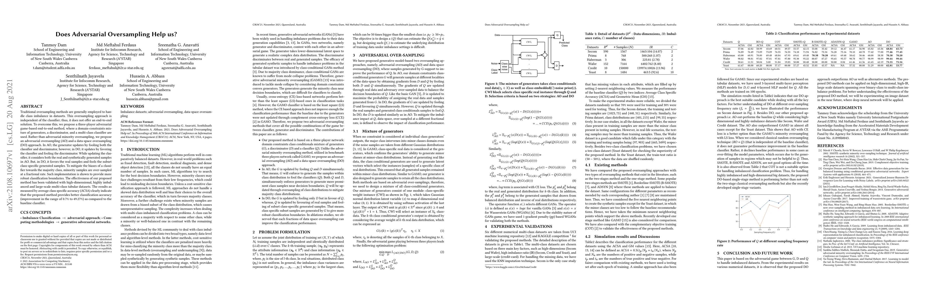 This paper proposes an adversarial oversampling method to address class imbalance in datasets, employing a three-player adversarial game involving generators, a discriminator, and a classifier. The method shows significant improvement in classification accuracy (0.7% to 49.27%) over baseline classifiers, validated on large-scale multi-class datasets.
