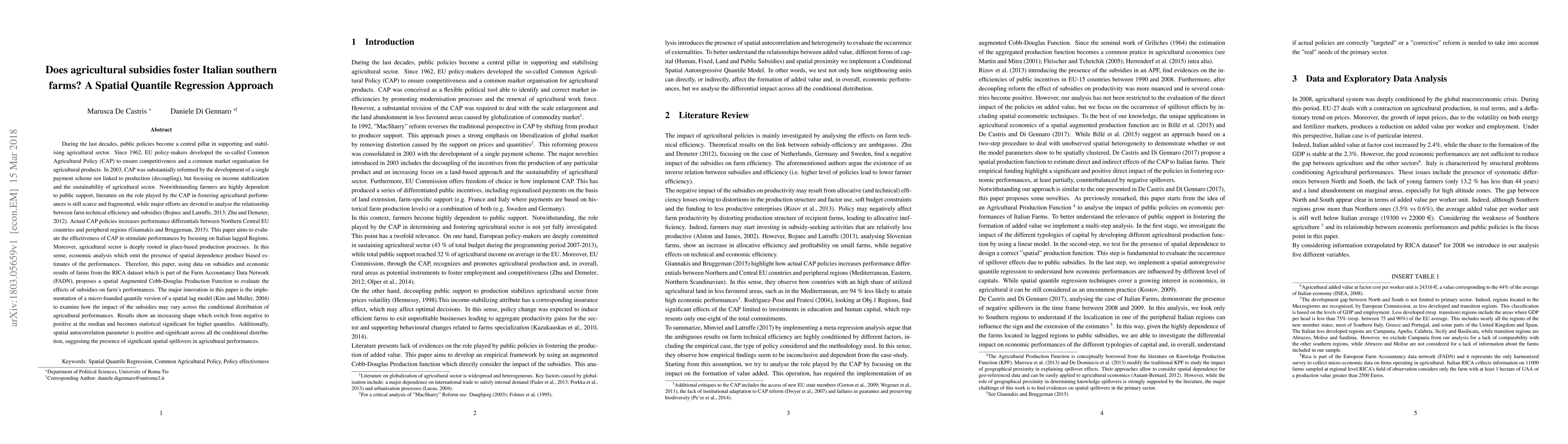 This study uses spatial analysis to investigate how Italian agricultural subsidies impact farm performance in Southern Italy, finding that subsidies have a positive effect on higher quantiles of productivity.