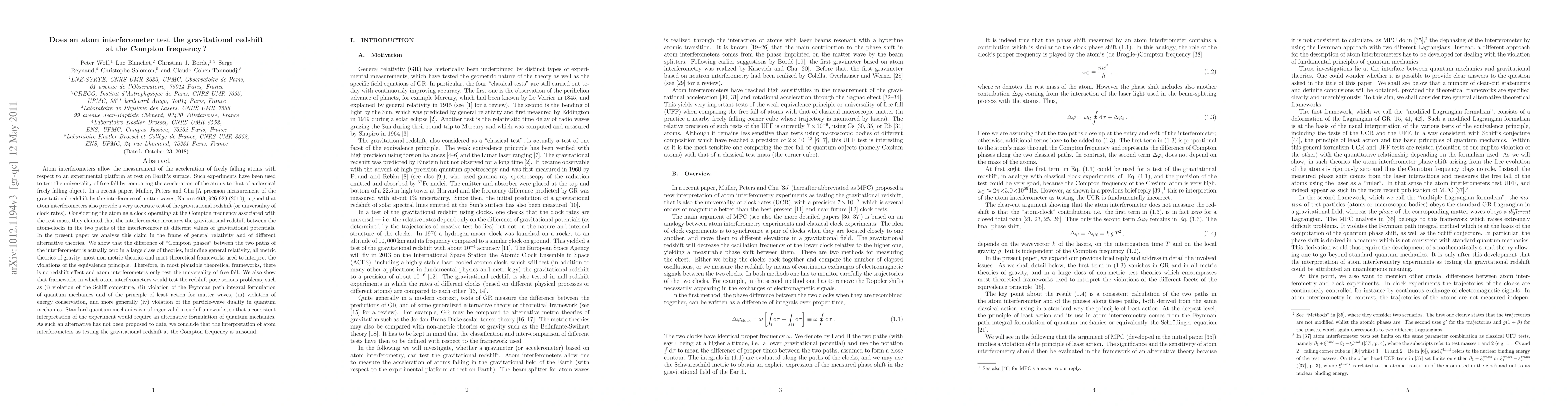 Atom interferometers allow the measurement of the acceleration of freely falling atoms with respect to an experimental platform at rest on Earth's surface. Such experiments have been used to test the universality of free fall by comparing the acceleration of the atoms to that of a classical freely falling object. In a recent paper, M\"uller, Peters and Chu [Nature {\bf 463}, 926-929 (2010)] argued that atom interferometers also provide a very accurate test of the gravitational redshift when considering the atom as a clock operating at the Compton frequency associated with the rest mass. We analyze this claim in the frame of general relativity and of different alternative theories. We show that the difference of "Compton phases" between the two paths of the interferometer is actually zero in a large class of theories, including general relativity, all metric theories of gravity, most non-metric theories and most theoretical frameworks used to interpret the violations of the equivalence principle. Therefore, in most plausible theoretical frameworks, there is no redshift effect and atom interferometers only test the universality of free fall. We also show that frameworks in which atom interferometers would test the redshift pose serious problems, such as (i) violation of the Schiff conjecture, (ii) violation of the Feynman path integral formulation of quantum mechanics and of the principle of least action for matter waves, (iii) violation of energy conservation, and more generally (iv) violation of the particle-wave duality in quantum mechanics. Standard quantum mechanics is no longer valid in such frameworks, so that a consistent interpretation of the experiment would require an alternative formulation of quantum mechanics. As such an alternative has not been proposed to date, we conclude that the interpretation of atom interferometers as testing the gravitational redshift is unsound.
