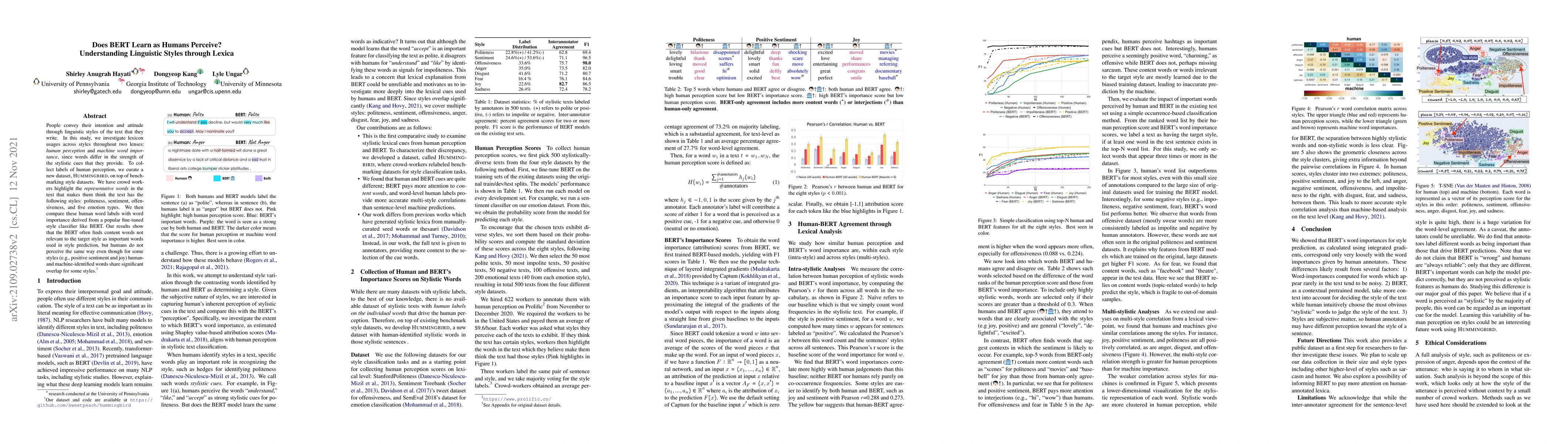 This study explores whether BERT's word importance aligns with human perception of linguistic styles, using a new dataset, Hummingbird, where crowd workers label stylistically significant words. Results indicate that while BERT often highlights content words irrelevant to style, humans focus on different cues, though some overlap exists for styles like positive sentiment and joy.