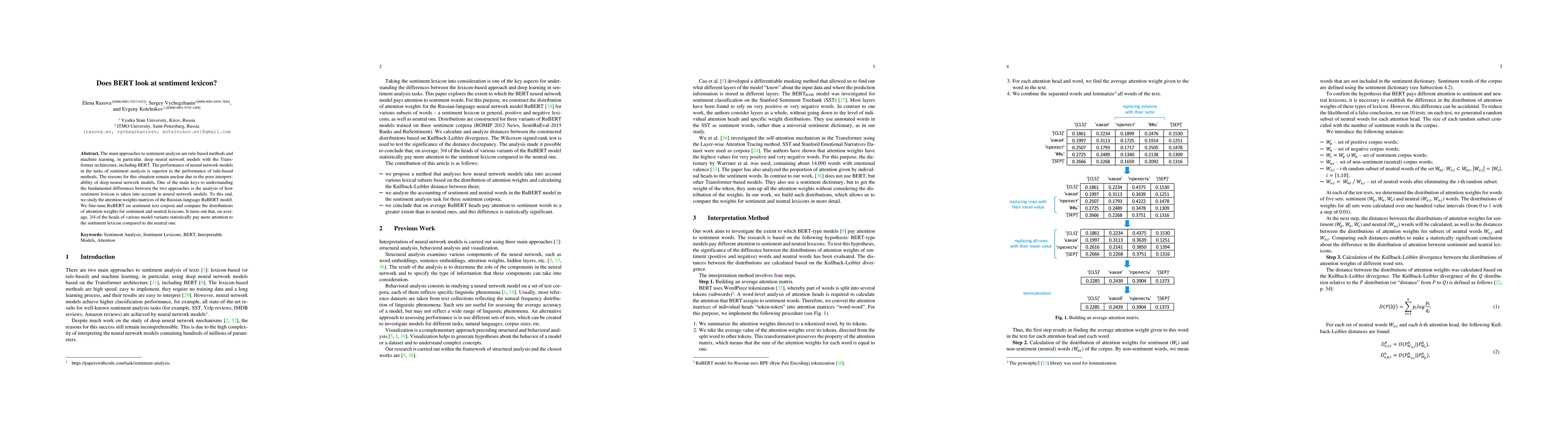 The main approaches to sentiment analysis are rule-based methods and ma-chine learning, in particular, deep neural network models with the Trans-former architecture, including BERT. The performance of neural network models in the tasks of sentiment analysis is superior to the performance of rule-based methods. The reasons for this situation remain unclear due to the poor interpretability of deep neural network models. One of the main keys to understanding the fundamental differences between the two approaches is the analysis of how sentiment lexicon is taken into account in neural network models. To this end, we study the attention weights matrices of the Russian-language RuBERT model. We fine-tune RuBERT on sentiment text corpora and compare the distributions of attention weights for sentiment and neutral lexicons. It turns out that, on average, 3/4 of the heads of various model var-iants statistically pay more attention to the sentiment lexicon compared to the neutral one.