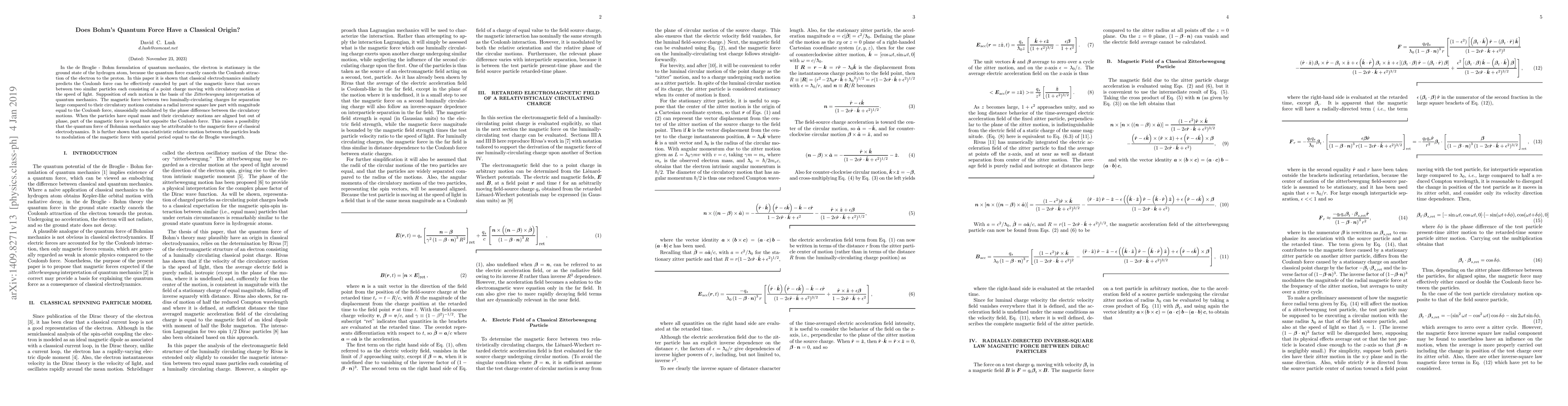 This paper explores whether Bohm's quantum force in the de Broglie-Bohm theory can be derived from classical electrodynamics, demonstrating that classical magnetic forces between luminally-circulating charges can cancel the Coulomb force, suggesting a classical origin for the quantum force. The study also shows that relative motion modulates the magnetic force with a spatial period matching the de Broglie wavelength.