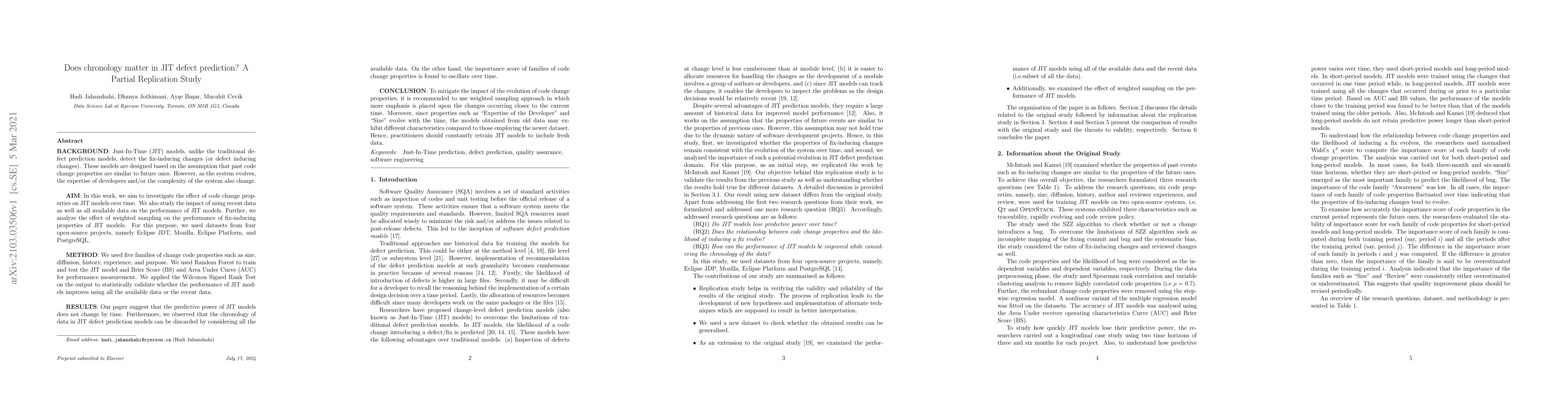 This study investigates whether the chronology of code change properties affects Just-In-Time (JIT) defect prediction models. The research finds that JIT models maintain their predictive power over time and that using all available data can discard the need for chronological order. However, the importance of code change properties fluctuates, suggesting the use of weighted sampling to emphasize recent changes.