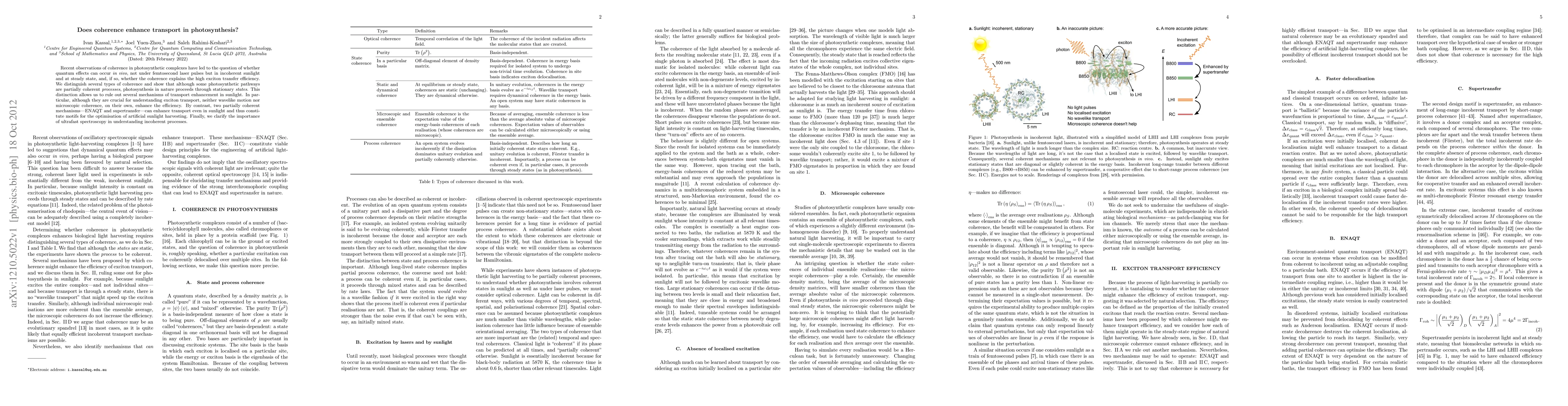 The paper distinguishes between various types of coherence in photosynthesis, ruling out wavelike motion and microscopic coherence as efficiency enhancers. It identifies two partially coherent mechanisms, ENAQT and supertransfer, as potential optimizers for artificial sunlight harvesting, while emphasizing the role of ultrafast spectroscopy in understanding incoherent processes.