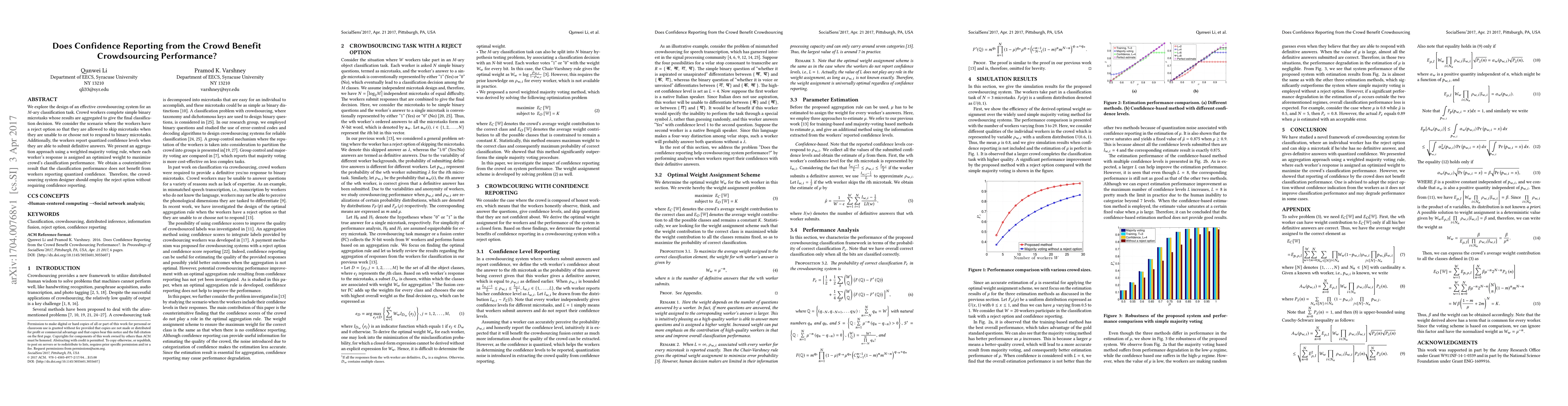 This study investigates the impact of crowd workers reporting confidence levels on crowdsourcing performance for an $M$-ary classification task. Despite workers having a reject option and reporting confidence, the research finds that confidence reporting does not improve classification performance, suggesting that the reject option alone is sufficient for effective system design.