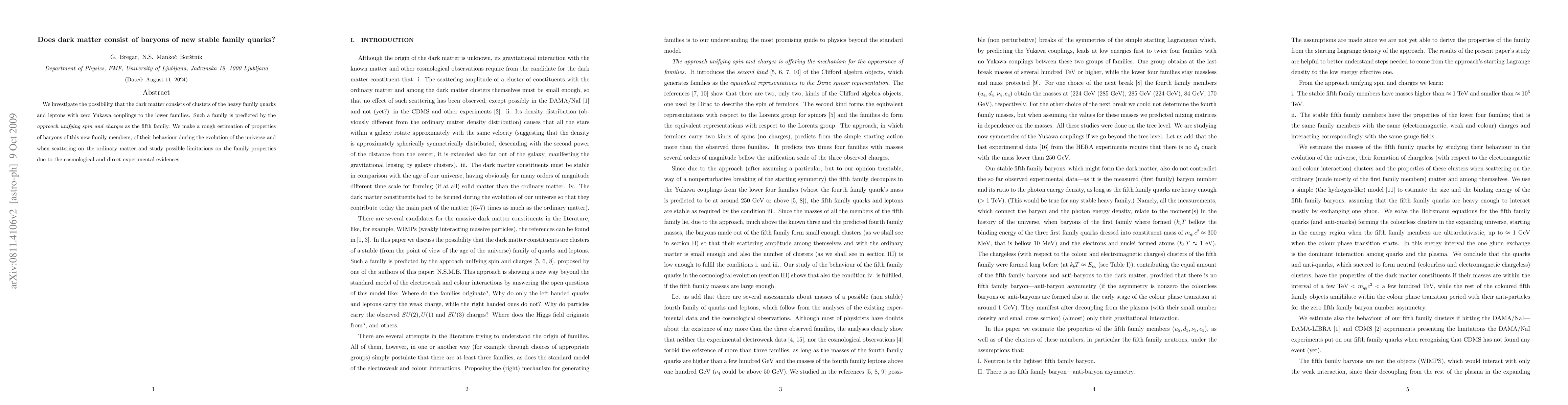 We investigate the possibility that the dark matter consists of clusters of the heavy family quarks and leptons with zero Yukawa couplings to the lower families. Such a family is predicted by the {\it approach unifying spin and charges} as the fifth family. We make a rough estimation of properties of baryons of this new family members, of their behaviour during the evolution of the universe and when scattering on the ordinary matter and study possible limitations on the family properties due to the cosmological and direct experimental evidences.