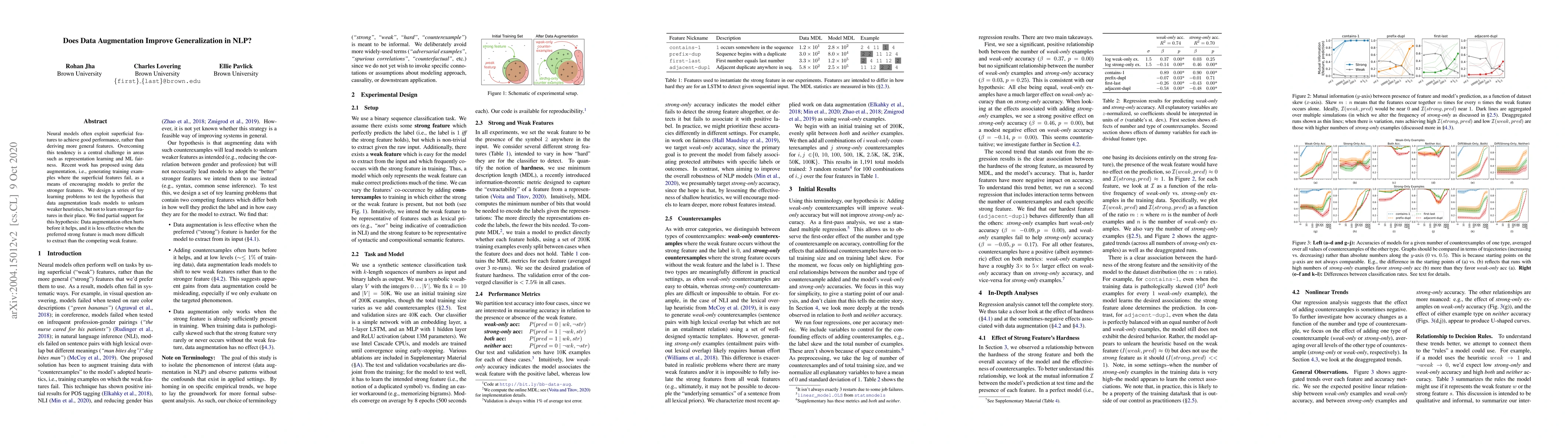 Neural models often exploit superficial features to achieve good performance, rather than deriving more general features. Overcoming this tendency is a central challenge in areas such as representation learning and ML fairness. Recent work has proposed using data augmentation, i.e., generating training examples where the superficial features fail, as a means of encouraging models to prefer the stronger features. We design a series of toy learning problems to test the hypothesis that data augmentation leads models to unlearn weaker heuristics, but not to learn stronger features in their place. We find partial support for this hypothesis: Data augmentation often hurts before it helps, and it is less effective when the preferred strong feature is much more difficult to extract than the competing weak feature.