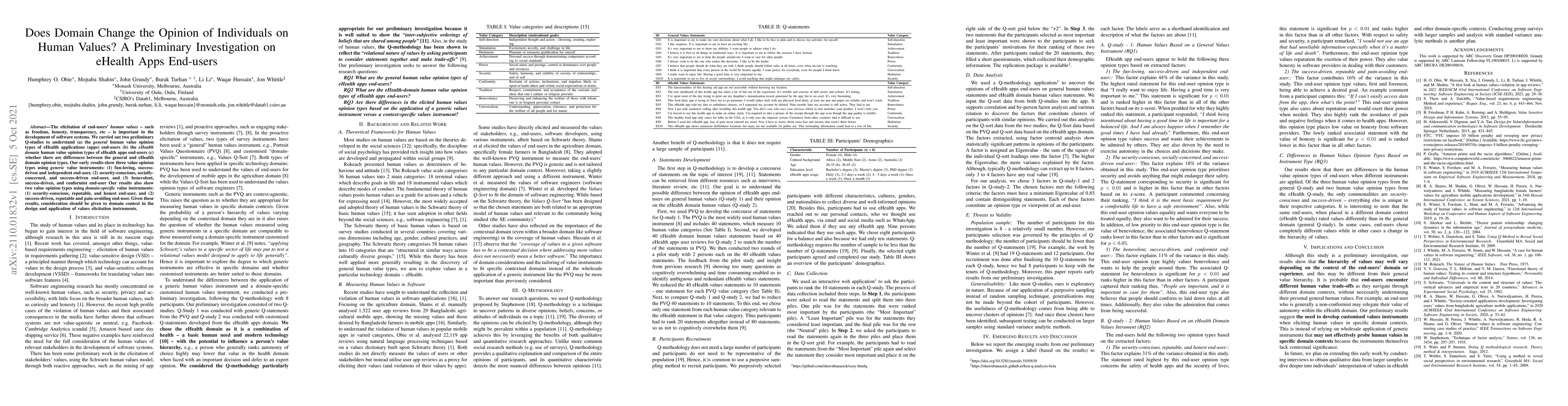The elicitation of end-users' human values - such as freedom, honesty, transparency, etc. - is important in the development of software systems. We carried out two preliminary Q-studies to understand (a) the general human value opinion types of eHealth applications (apps) end-users (b) the eHealth domain human value opinion types of eHealth apps end-users (c) whether there are differences between the general and eHealth domain opinion types. Our early results show three value opinion types using generic value instruments: (1) fun-loving, success-driven and independent end-user, (2) security-conscious, socially-concerned, and success-driven end-user, and (3) benevolent, success-driven, and conformist end-user Our results also show two value opinion types using domain-specific value instruments: (1) security-conscious, reputable, and honest end-user, and (2) success-driven, reputable and pain-avoiding end-user. Given these results, consideration should be given to domain context in the design and application of values elicitation instruments.