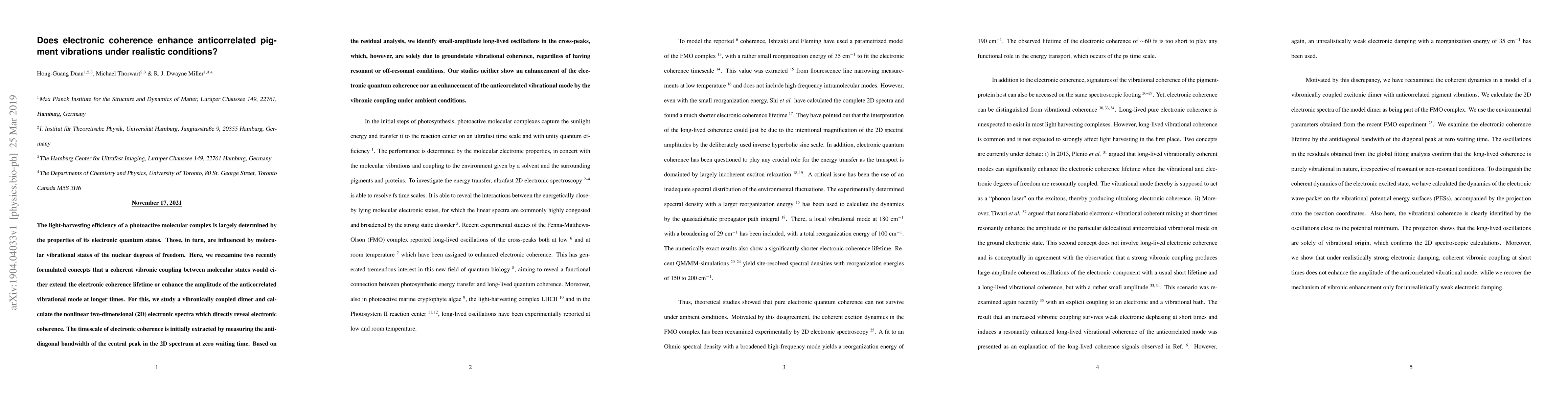 This study investigates whether electronic coherence enhances anticorrelated pigment vibrations in photoactive molecular complexes under realistic conditions. The research finds no evidence that coherent vibronic coupling extends electronic coherence lifetime or amplifies anticorrelated vibrational modes, despite examining a vibronically coupled dimer through nonlinear two-dimensional electronic spectra.