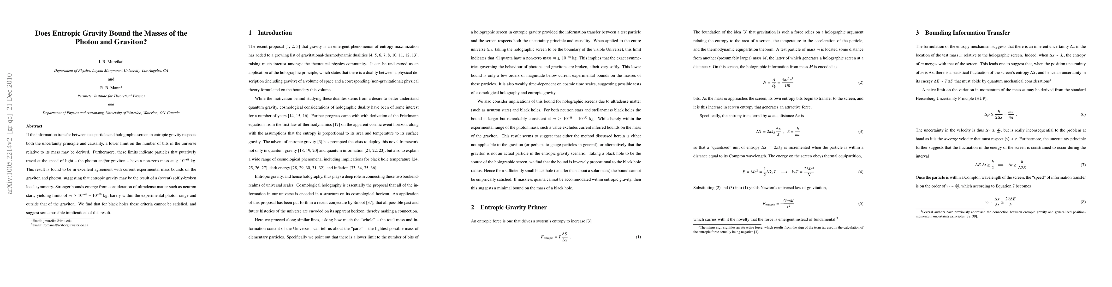If the information transfer between test particle and holographic screen in entropic gravity respects both the uncertainty principle and causality, a lower limit on the number of bits in the universe relative to its mass may be derived. Furthermore, these limits indicate particles that putatively travel at the speed of light -- the photon and/or graviton -- have a non-zero mass $m \geq 10^{-68}~$kg. This result is found to be in excellent agreement with current experimental mass bounds on the graviton and photon, suggesting that entropic gravity may be the result of a (recent) softly-broken local symmetry. Stronger bounds emerge from consideration of ultradense matter such as neutron stars, yielding limits of $m \geq 10^{-48}-10^{-50}~$kg, barely within the experimental photon range and outside that of the graviton. We find that for black holes these criteria cannot be satisfied, and suggest some possible implications of this result.