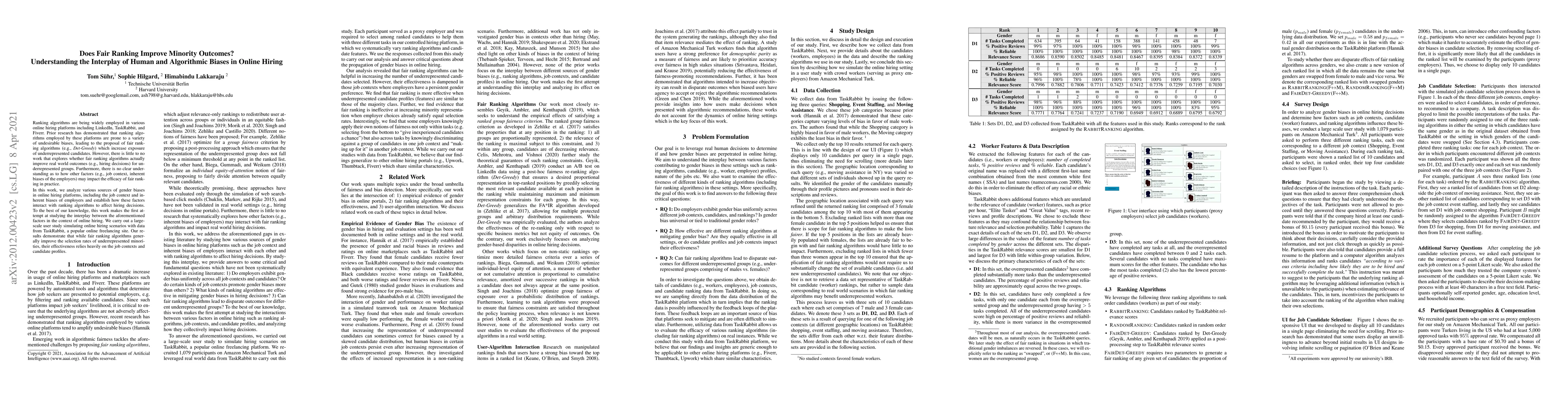 This paper investigates the impact of fair ranking algorithms on minority hiring outcomes in online platforms, examining the interplay between algorithmic and human biases. It finds that while fair ranking can improve selection rates for underrepresented groups, its effectiveness is contingent on job context and inherent employer biases.