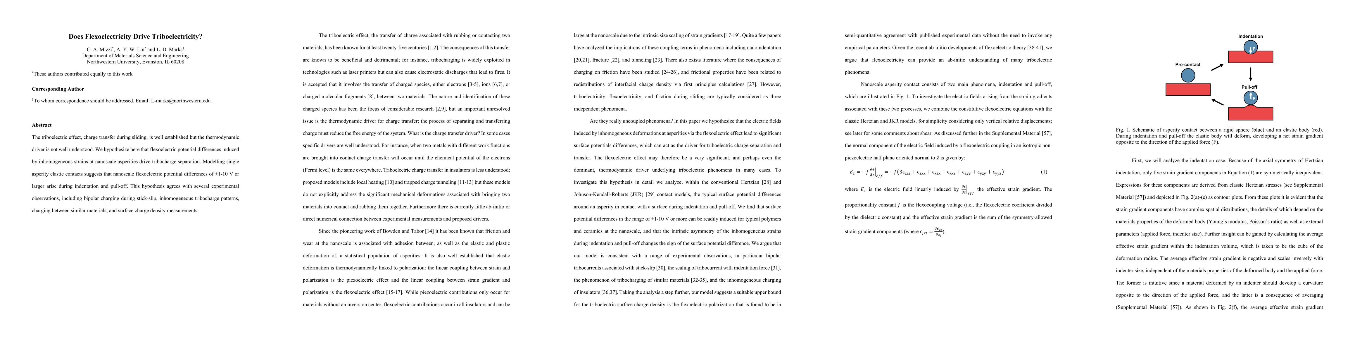 New research suggests that flexoelectricity, a property of materials responding to strain, drives triboelectricity, the transfer of charge during friction. The study found that nanoscale flexoelectric potential differences can be as high as 1-10 volts, supporting experimental observations of bipolar charging and inhomogeneous tribocharge patterns.