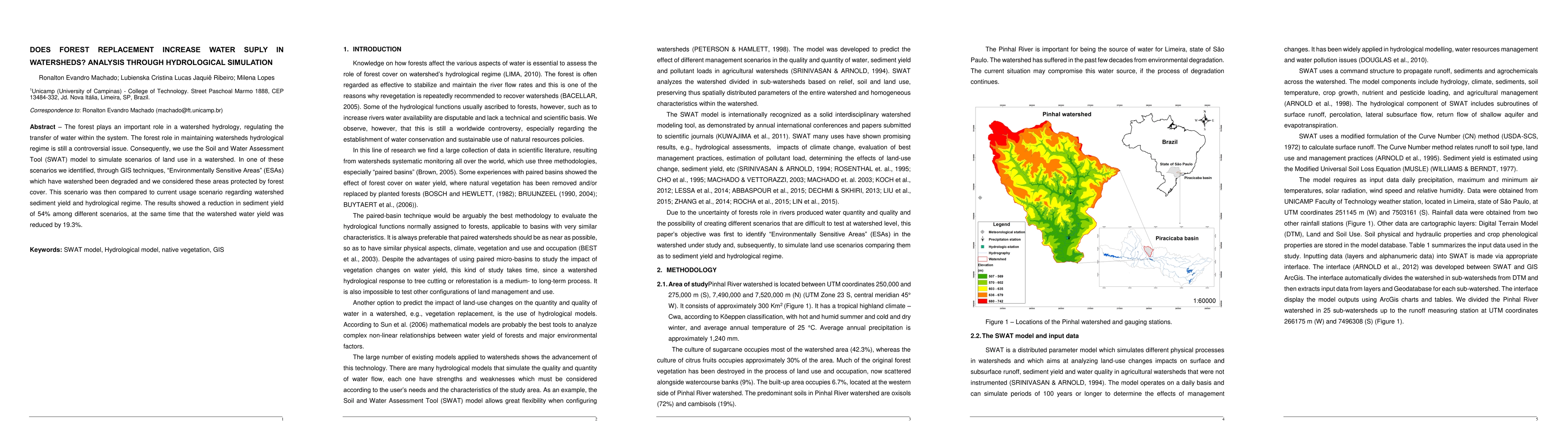The forest plays an important role in a watershed hydrology, regulating the transfer of water within the system. The forest role in maintaining watersheds hydrological regime is still a controversial issue. Consequently, we use the Soil and Water Assessment Tool (SWAT) model to simulate scenarios of land use in a watershed. In one of these scenarios we identified, through GIS techniques, Environmentally Sensitive Areas (ESAs) which have watershed been degraded and we considered these areas protected by forest cover. This scenario was then compared to current usage scenario regarding watershed sediment yield and hydrological regime. The results showed a reduction in sediment yield of 54% among different scenarios, at the same time that the watershed water yield was reduced by 19.3%.
