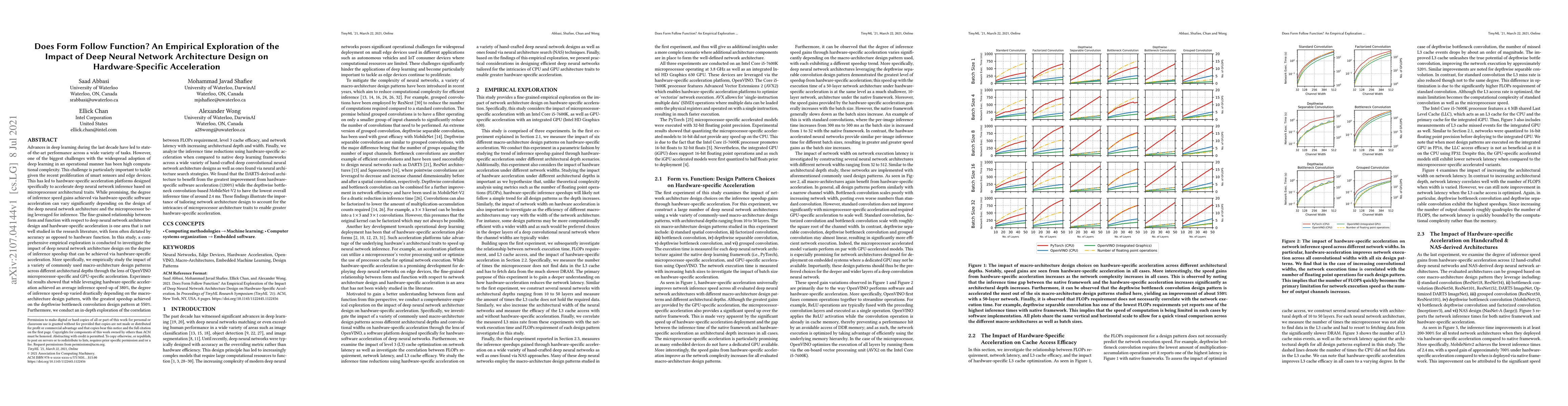 The fine-grained relationship between form and function with respect to deep neural network architecture design and hardware-specific acceleration is one area that is not well studied in the research literature, with form often dictated by accuracy as opposed to hardware function. In this study, a comprehensive empirical exploration is conducted to investigate the impact of deep neural network architecture design on the degree of inference speedup that can be achieved via hardware-specific acceleration. More specifically, we empirically study the impact of a variety of commonly used macro-architecture design patterns across different architectural depths through the lens of OpenVINO microprocessor-specific and GPU-specific acceleration. Experimental results showed that while leveraging hardware-specific acceleration achieved an average inference speed-up of 380%, the degree of inference speed-up varied drastically depending on the macro-architecture design pattern, with the greatest speedup achieved on the depthwise bottleneck convolution design pattern at 550%. Furthermore, we conduct an in-depth exploration of the correlation between FLOPs requirement, level 3 cache efficacy, and network latency with increasing architectural depth and width. Finally, we analyze the inference time reductions using hardware-specific acceleration when compared to native deep learning frameworks across a wide variety of hand-crafted deep convolutional neural network architecture designs as well as ones found via neural architecture search strategies. We found that the DARTS-derived architecture to benefit from the greatest improvement from hardware-specific software acceleration (1200%) while the depthwise bottleneck convolution-based MobileNet-V2 to have the lowest overall inference time of around 2.4 ms.