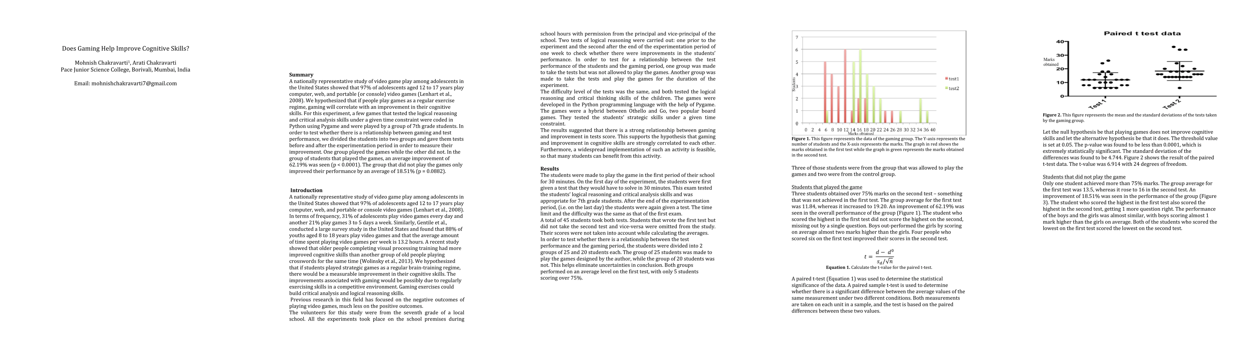 A nationally representative study of video game play among adolescents in the United States showed that 97% of adolescents aged 12 to 17 years play computer, web, and portable (or console) video games (Lenhart et al., 2008). We hypothesized that if people play games as a regular exercise regime, gaming will correlate with an improvement in their cognitive skills. For this experiment, a few games that tested the logical reasoning and critical analysis skills under a given time constraint were coded in Python using Pygame and were played by a group of 7th grade students. In order to test whether there is a relationship between gaming and test performance, we divided the students into two groups and gave them tests before and after the experimentation period in order to measure their improvement. One group played the games while the other did not. In the group of students that played the games, an average improvement of 62.19% was seen (p < 0.0001). The group that did not play the games only improved their performance by an average of 18.51% (p = 0.0882).