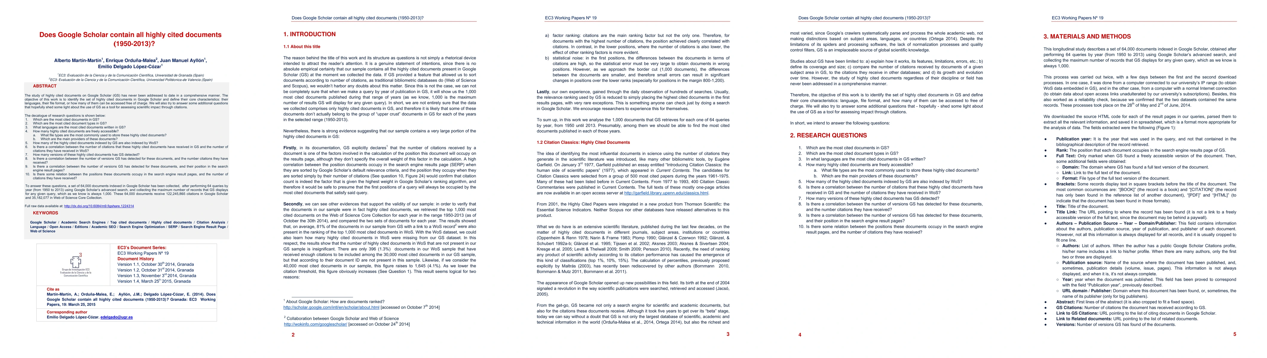 This study investigates the completeness and characteristics of highly cited documents in Google Scholar (GS) from 1950-2013, examining their types, languages, accessibility, and citation correlations with Web of Science (WoS). It aims to assess GS's efficacy as a tool for scientific impact measurement.