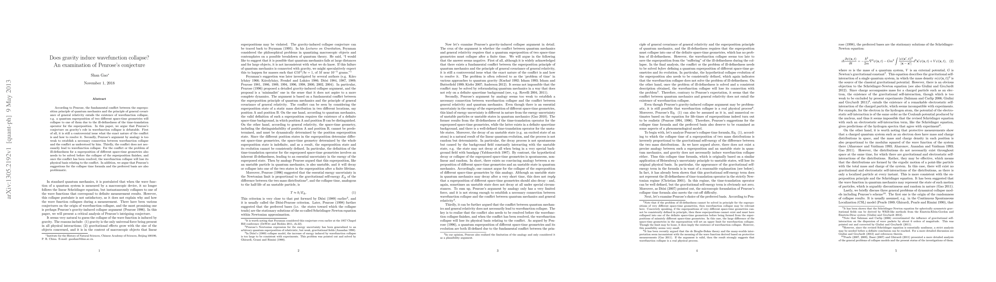 This paper critically examines Penrose's conjecture that gravity induces wavefunction collapse due to a conflict between quantum mechanics and general relativity. It argues that the conjecture is debatable, as the nature of the conflict remains unresolved and Penrose's analogy is insufficient to establish a necessary connection between the conflict and wavefunction collapse.