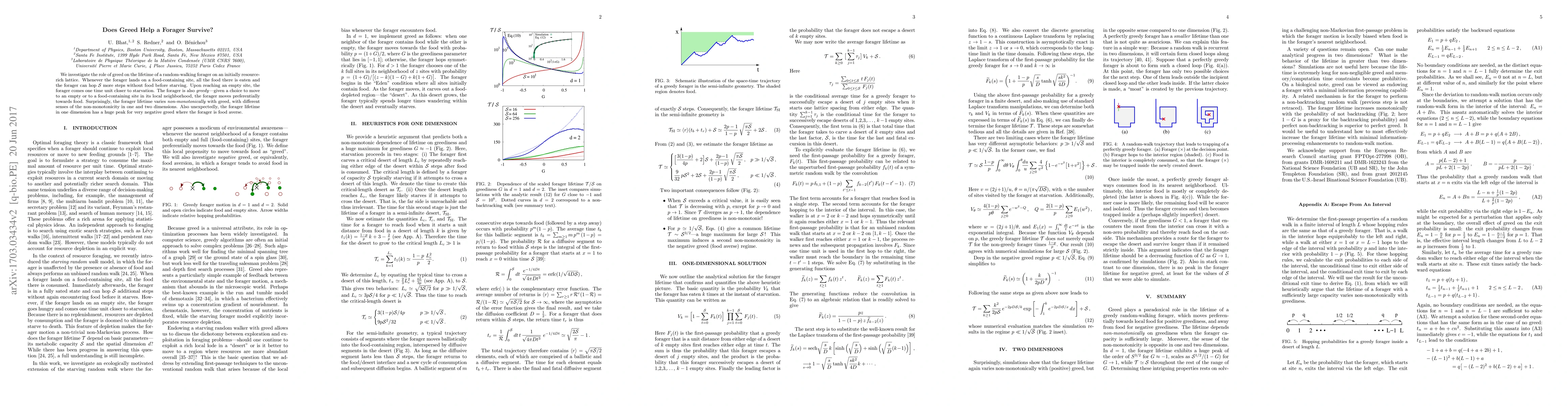 This study explores how greed influences the survival of a random-walking forager on a resource-rich lattice, finding that the forager's lifetime varies non-monotonically with greed levels, with distinct patterns in one and two dimensions, and a notably high peak for very negative greed in one dimension.