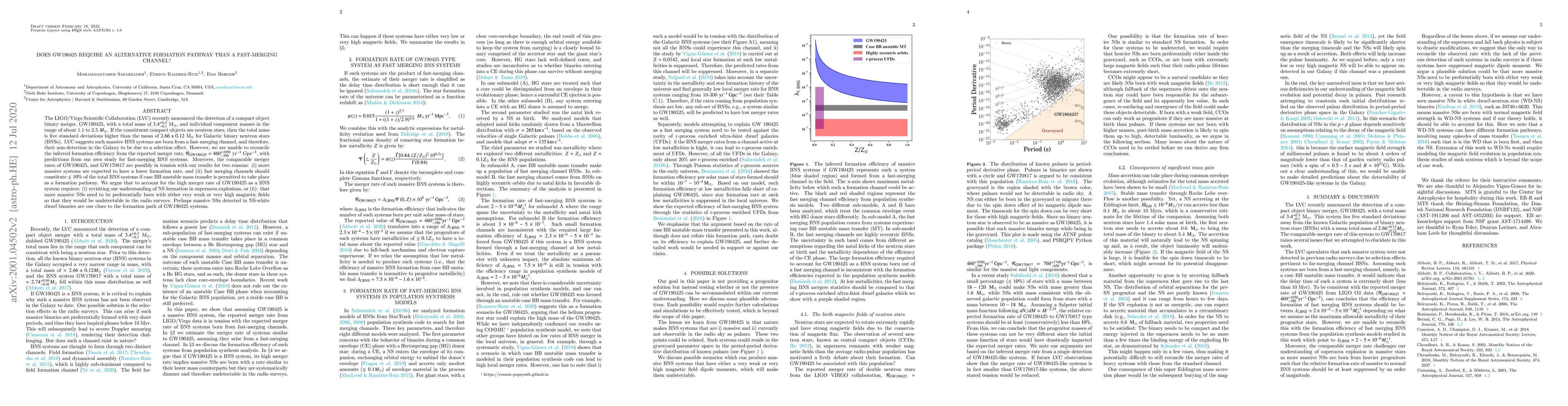 The LIGO/Virgo detection of GW190425, a massive binary neutron star merger, challenges the fast-merging channel formation model due to its high inferred merger rate and mass discrepancy with typical Galactic systems. The study suggests alternative formation pathways or revised neutron star formation models may be needed.