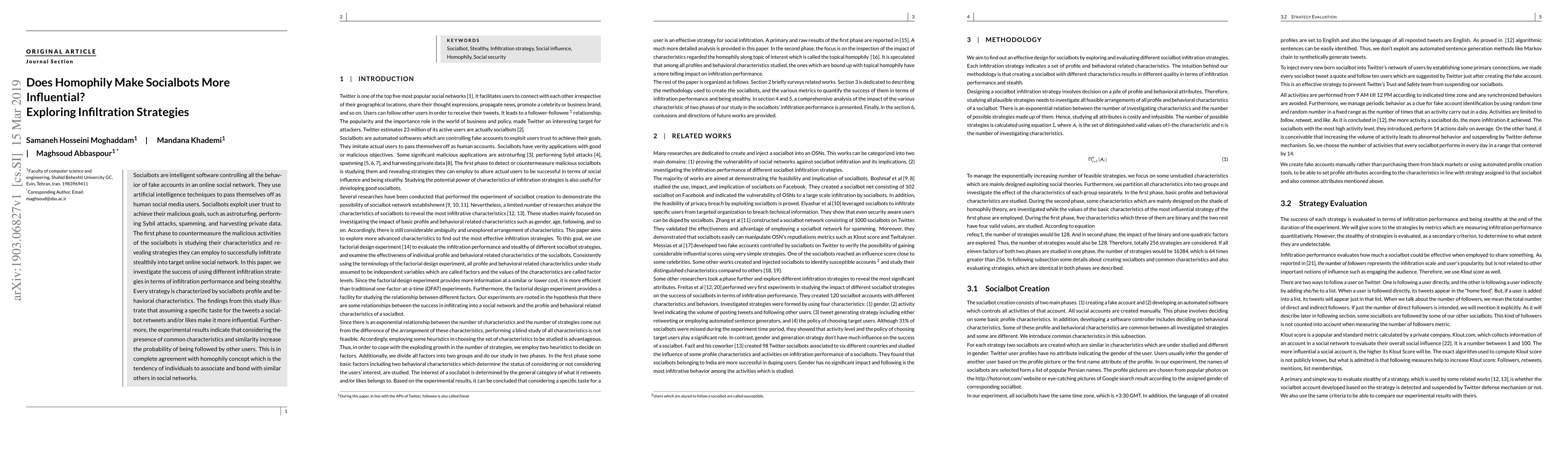 Socialbots are intelligent software controlling all the behavior of fake accounts in an online social network. They use artificial intelligence techniques to pass themselves off as human social media users. Socialbots exploit user trust to achieve their malicious goals, such as astroturfing, performing Sybil attacks, spamming, and harvesting private data. The first phase to countermeasure the malicious activities of the socialbots is studying their characteristics and revealing strategies they can employ to successfully infiltrate stealthily into target online social network. In this paper,we investigate the success of using different infiltration strategies in terms of infiltration performance and being stealthy. Every strategy is characterized by socialbots profile and behavioral characteristics. The findings from this study illustrate that assuming a specific taste for the tweets a socialbot retweets and/or likes make it more influential. Furthermore, the experimental results indicate that considering the presence of common characteristics and similarity increase the probability of being followed by other users. This is in complete agreement with homophily concept which is the tendency of individuals to associate and bond with similar others in social networks.