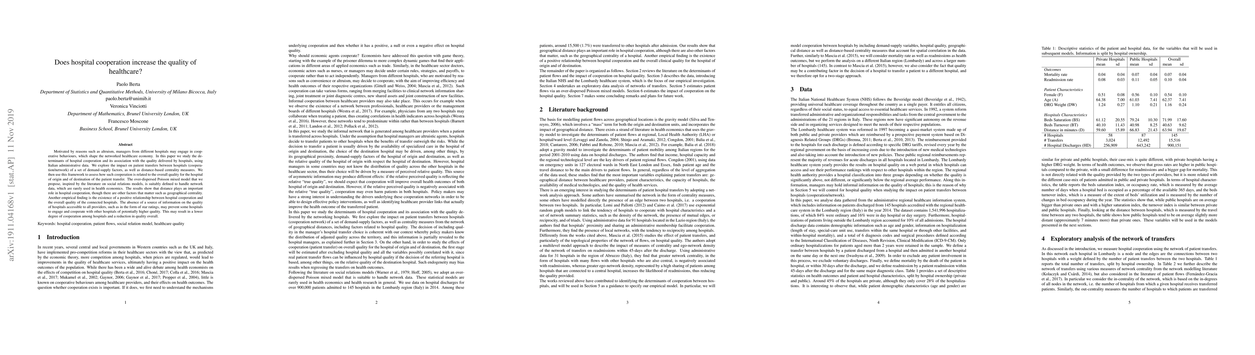 Motivated by reasons such as altruism, managers from different hospitals may engage in cooperative behaviours, which shape the networked healthcare economy. In this paper we study the determinants of hospital cooperation and its association with the quality delivered by hospitals, using Italian administrative data. We explore the impact on patient transfers between hospitals (cooperation/network) of a set of demand-supply factors, as well as distance-based centrality measures. We then use this framework to assess how such cooperation is related to the overall quality for the hospital of origin and of destination of the patient transfer. The over-dispersed Poisson mixed model that we propose, inspired by the literature on social relations models, is suitably defined to handle network data, which are rarely used in health economics. The results show that distance plays an important role in hospital cooperation, though there are other factors that matter such as geographical centrality. Another empirical finding is the existence of a positive relationship between hospital cooperation and the overall quality of the connected hospitals. The absence of a source of information on the quality of hospitals accessible to all providers, such as in the form of star ratings, may prevent some hospitals to engage and cooperate with other hospitals of potentially higher quality. This may result in a lower degree of cooperation among hospitals and a reduction in quality overall.