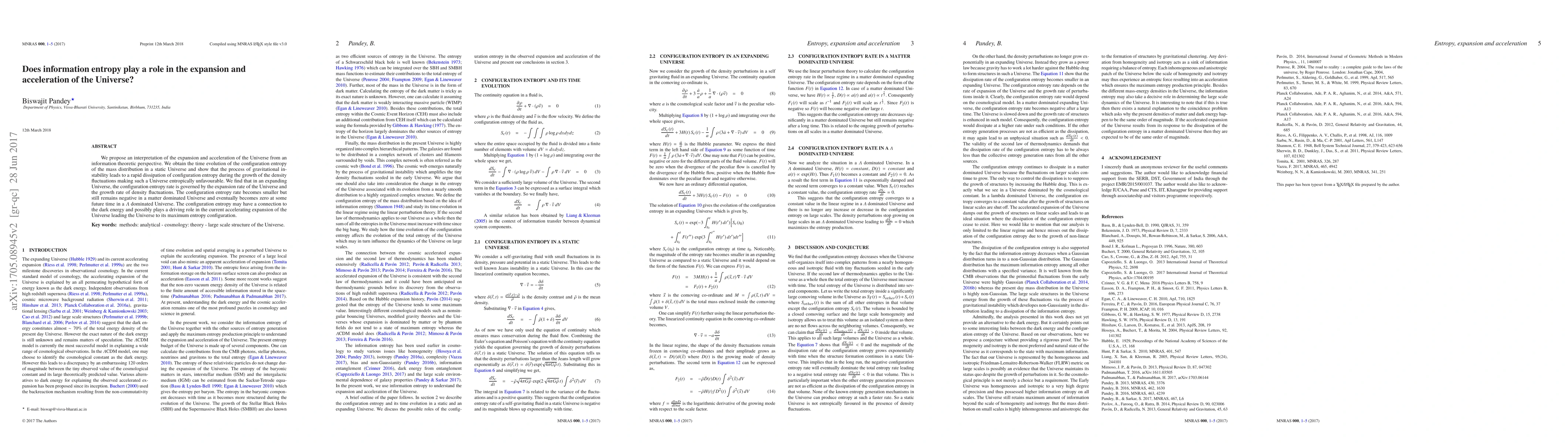 This paper explores the role of information entropy in the expansion and acceleration of the Universe, suggesting that gravitational instability leads to entropy dissipation, making an expanding Universe more entropically favorable. It posits that configuration entropy may be linked to dark energy and could drive the current accelerating expansion towards a state of maximum entropy.