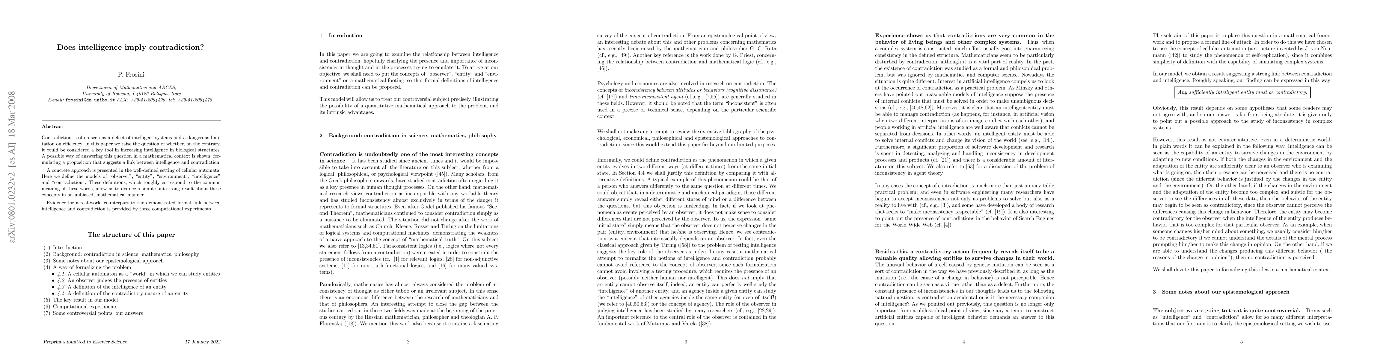 Contradiction is often seen as a defect of intelligent systems and a dangerous limitation on efficiency. In this paper we raise the question of whether, on the contrary, it could be considered a key tool in increasing intelligence in biological structures. A possible way of answering this question in a mathematical context is shown, formulating a proposition that suggests a link between intelligence and contradiction. A concrete approach is presented in the well-defined setting of cellular automata. Here we define the models of ``observer'', ``entity'', ``environment'', ``intelligence'' and ``contradiction''. These definitions, which roughly correspond to the common meaning of these words, allow us to deduce a simple but strong result about these concepts in an unbiased, mathematical manner. Evidence for a real-world counterpart to the demonstrated formal link between intelligence and contradiction is provided by three computational experiments.