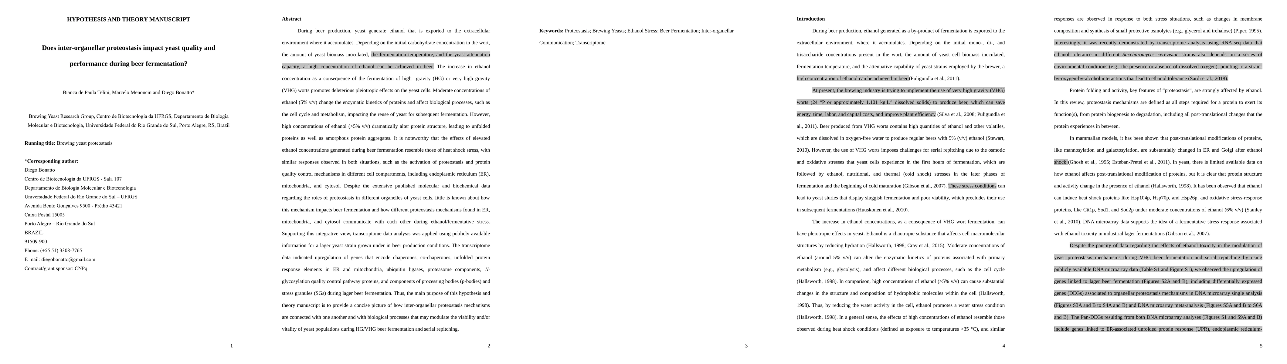 This paper explores how inter-organellar proteostasis mechanisms in yeast cells influence their quality and performance during beer fermentation, particularly under high-gravity conditions. Transcriptome data analysis reveals upregulation of proteostasis-related genes in endoplasmic reticulum, mitochondria, and cytosol, suggesting coordinated responses to ethanol/fermentative stress.