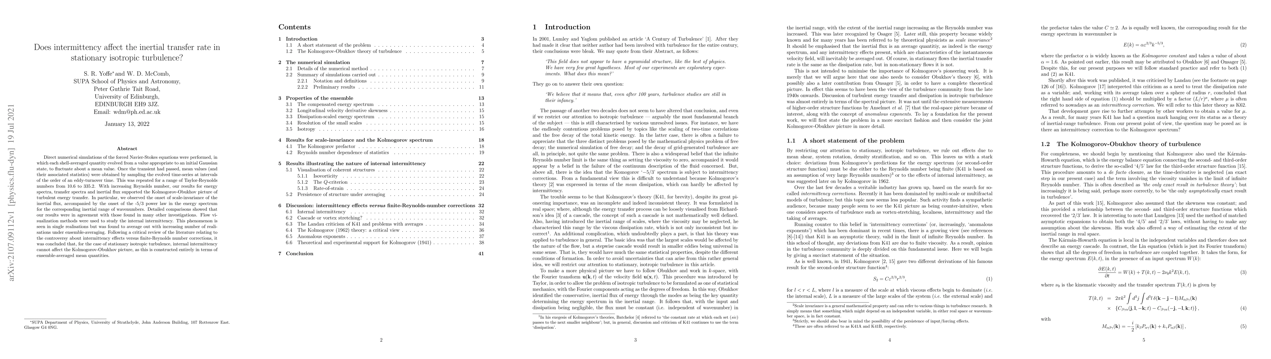 Direct numerical simulations of stationary isotropic turbulence revealed that intermittency does not affect inertial energy transfer rates, supporting the Kolmogorov-Obukhov picture, especially at higher Reynolds numbers.