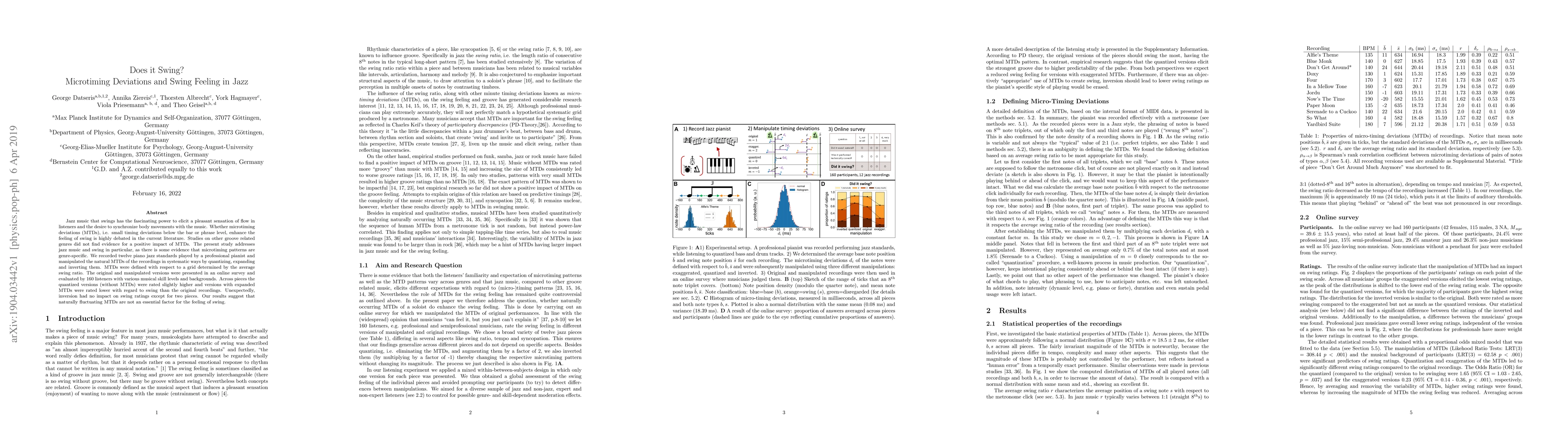 The study investigates whether microtiming deviations enhance the feeling of swing in jazz music, finding that quantized versions without deviations were rated higher for swing, while expanded deviations were rated lower. Contrary to expectations, inverting timing deviations had minimal impact, suggesting that natural MTDs are not crucial for swing perception.