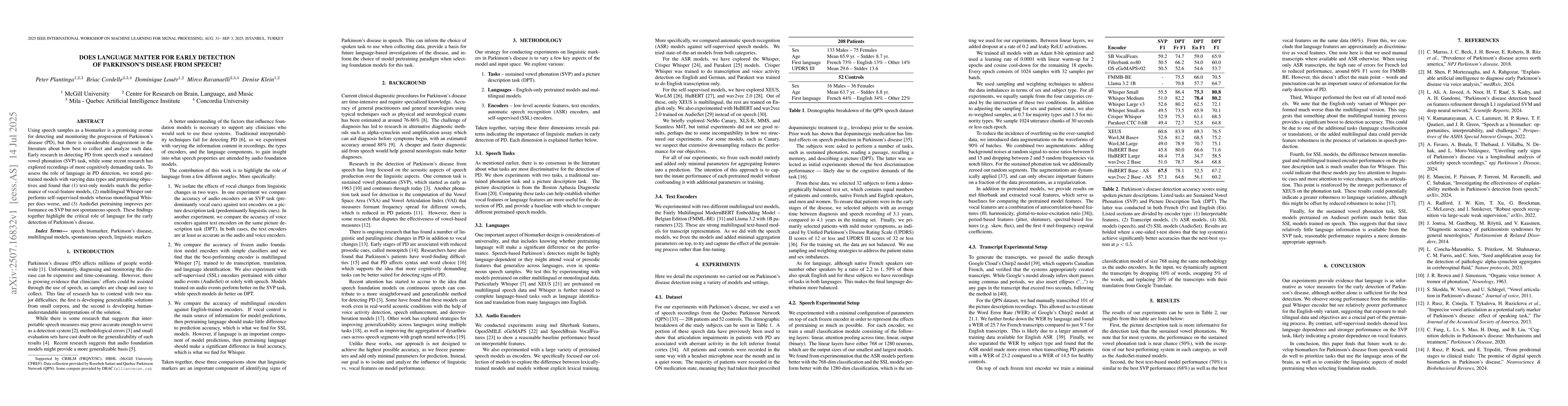 Using speech samples as a biomarker is a promising avenue for detecting and monitoring the progression of Parkinson's disease (PD), but there is considerable disagreement in the literature about how best to collect and analyze such data. Early research in detecting PD from speech used a sustained vowel phonation (SVP) task, while some recent research has explored recordings of more cognitively demanding tasks. To assess the role of language in PD detection, we tested pretrained models with varying data types and pretraining objectives and found that (1) text-only models match the performance of vocal-feature models, (2) multilingual Whisper outperforms self-supervised models whereas monolingual Whisper does worse, and (3) AudioSet pretraining improves performance on SVP but not spontaneous speech. These findings together highlight the critical role of language for the early detection of Parkinson's disease.