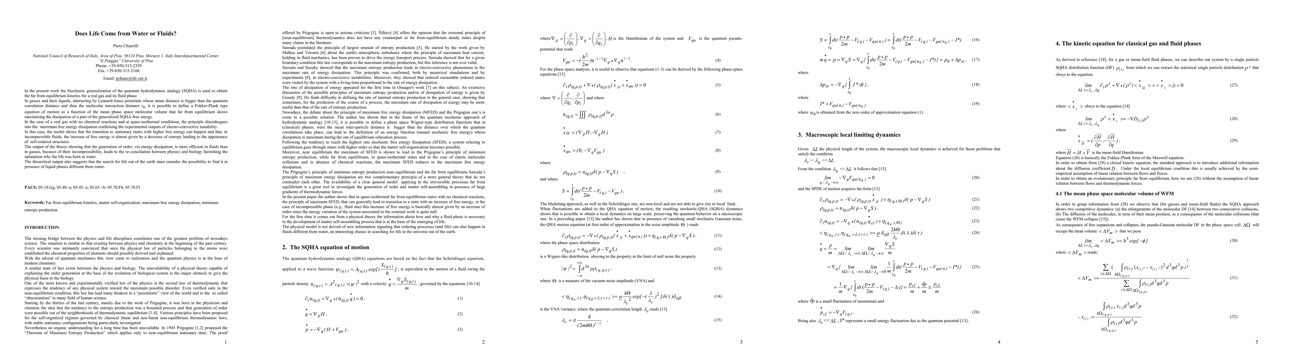 In the present work the Stochastic generalization of the quantum hydrodynamic analogy (SQHA) is used to obtain the far from equilibrium kinetics for a real gas and its fluid phase. In gasses and their liquids, interacting by Lennard-Jones potentials whose mean distance is bigger than the quantum correlation distance and than the molecular interaction distance r0, it is possible to define a Fokker-Plank type equation of motion as a function of the mean phase space molecular volume that far from equilibrium shows maximizing the dissipation of a part of the generalized SQHA-free energy. In the case of a real gas with no chemical reactions and at quasi-isothermal conditions, the principle disembogues into the maximum free energy dissipation confirming the experimental outputs of electro-convective instability. In this case, the model shows that the transition to stationary states with higher free energy can happen and that, in incompressible fluids, the increase of free energy is almost given by a decrease of entropy leading to the appearance of self-ordered structures. The output of the theory showing that the generation of order, via energy dissipation, is more efficient in fluids than in gasses, because of their incompressibility, leads to the re-conciliation between physics and biology furnishing the eplanation why the life was born in water. The theoretical output also suggests that the search for life out of the earth must consider the possibility to find it in presence of liquid phases different from water.