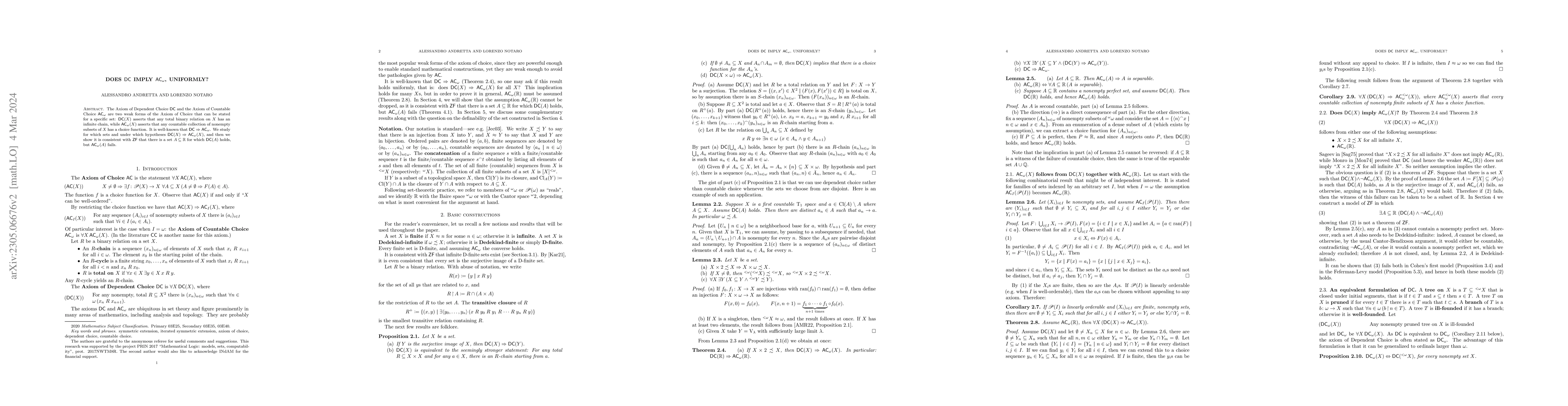 The paper examines whether the Axiom of Dependent Choice ($\mathsf{DC}$) uniformly implies the Axiom of Countable Choice ($\mathsf{AC}_\omega$) for specific sets, and demonstrates consistency in $\mathsf{ZF}$ where $\mathsf{DC}$ holds but $\mathsf{AC}_\omega$ fails for some set $A \subseteq \mathbb{R}$.