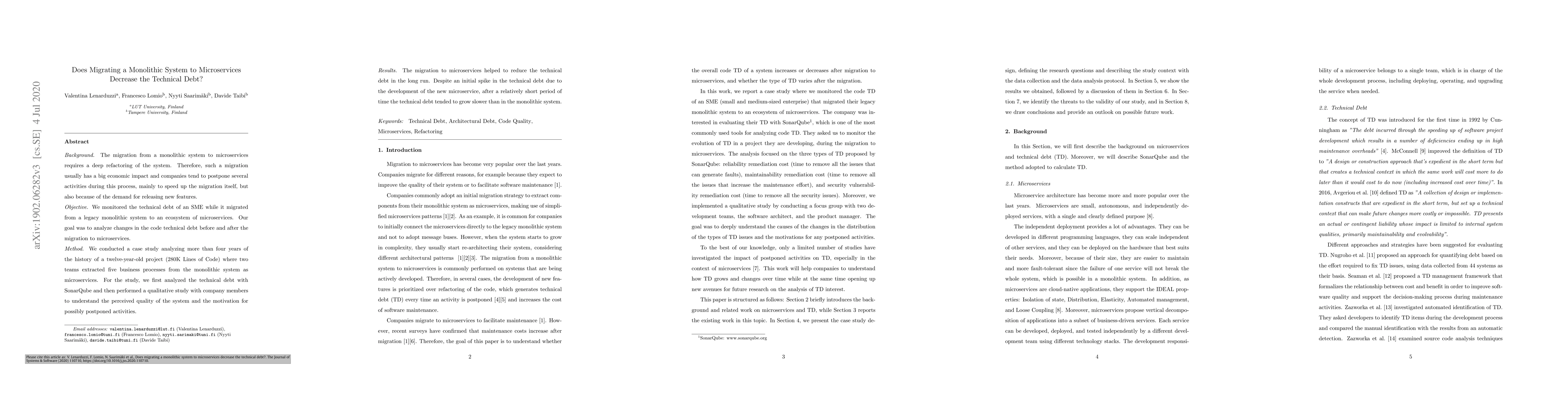 The migration from a monolithic system to microservices initially increases technical debt but leads to a slower growth rate in the long term, according to a case study monitoring a small and medium enterprise over four years.