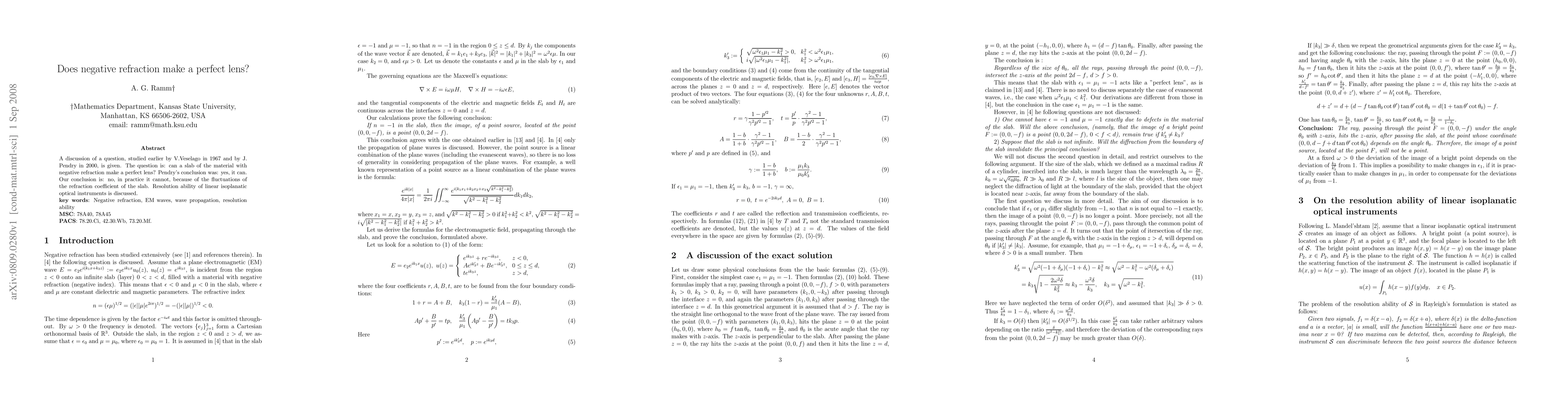 Summary: This paper revisits the question of whether negative refraction materials can form a perfect lens, confirming earlier conclusions by Pendry but arguing against it due to practical issues, specifically the fluctuations in the refraction coefficient, which hinder the lens's resolution ability.