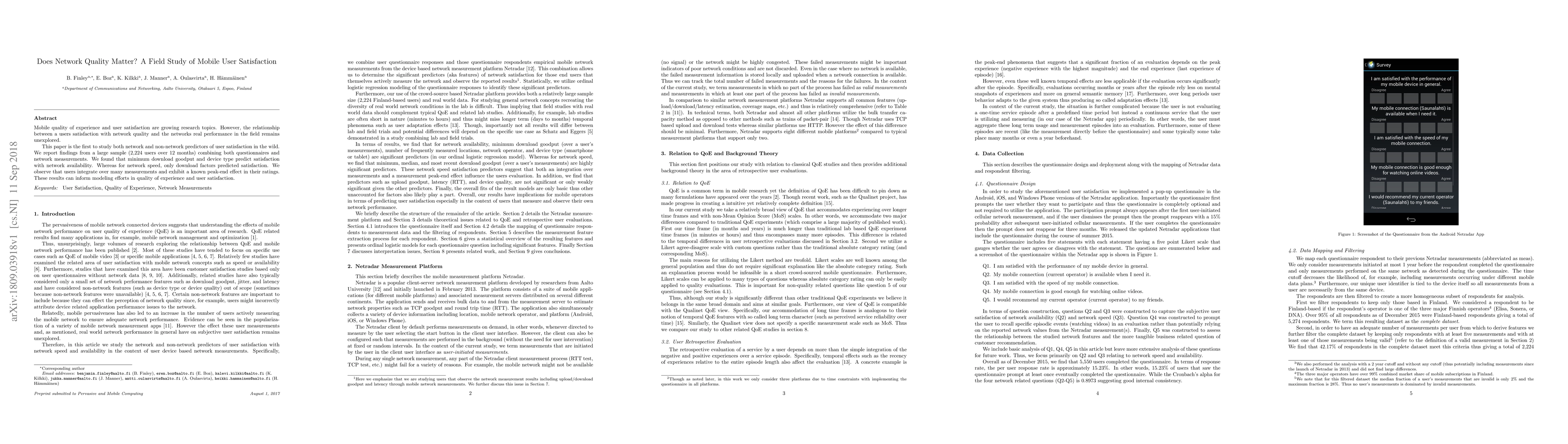 Mobile quality of experience and user satisfaction are growing research topics. However, the relationship between a user's satisfaction with network quality and the networks real performance in the field remains unexplored. This paper is the first to study both network and non-network predictors of user satisfaction in the wild. We report findings from a large sample (2224 users over 12 months) combining both questionnaires and network measurements. We found that minimum download goodput and device type predict satisfaction with network availability. Whereas for network speed, only download factors predicted satisfaction. We observe that users integrate over many measurements and exhibit a known peak-end effect in their ratings. These results can inform modeling efforts in quality of experience and user satisfaction.