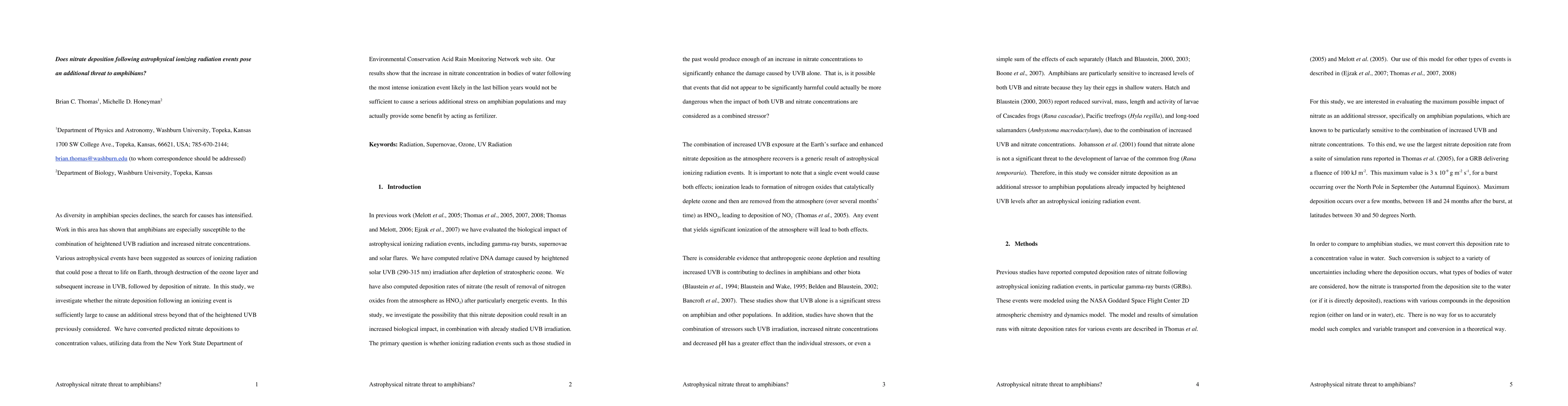 This study examines whether nitrate deposition following astrophysical ionizing radiation events could further stress amphibians, already vulnerable to increased UVB radiation. The results indicate that predicted nitrate concentrations from such events are unlikely to cause significant additional stress, potentially even benefiting amphibians by acting as a fertilizer.