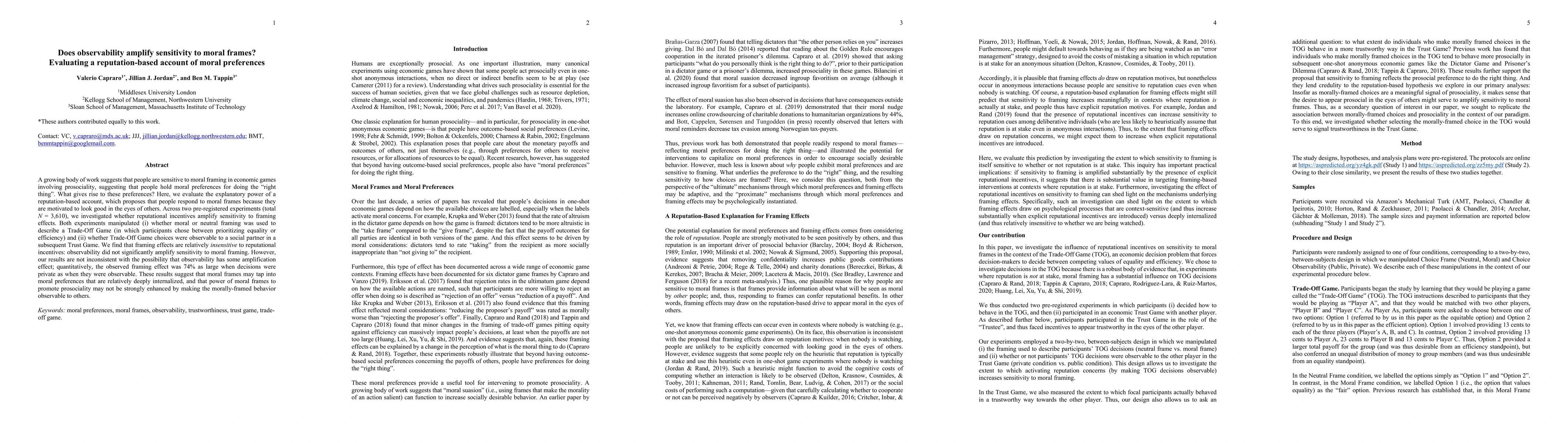 This study investigates whether observability amplifies sensitivity to moral frames in economic games, testing a reputation-based account of moral preferences. Results from two pre-registered experiments (N = 3,610) show that observability does not significantly enhance framing effects, suggesting moral frames tap into deeply internalized moral preferences rather than being strongly amplified by social observation.