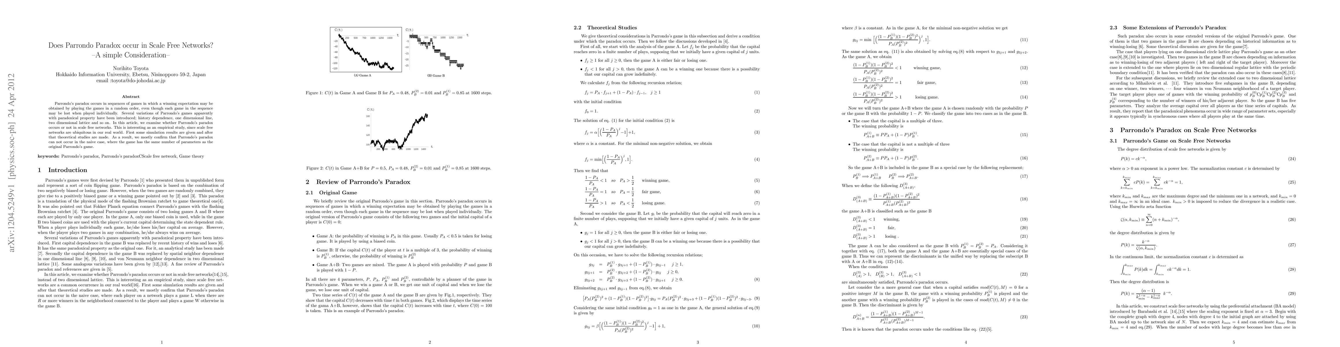 This paper investigates whether Parrondo's paradox, where a winning strategy emerges from random game sequences despite individual losses, occurs in scale-free networks. The study finds that Parrondo's paradox does not generally occur in these networks, even when simulations are conducted, indicating the paradox's absence in the simplest cases.