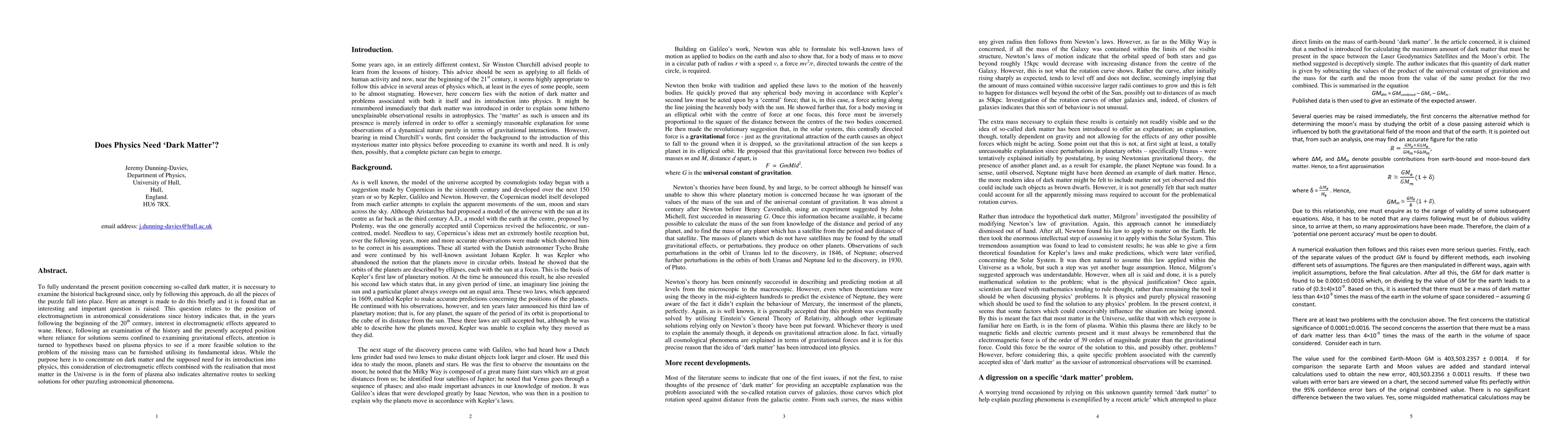 To fully understand the present position concerning so-called dark matter, it is necessary to examine the historical background since, only by following this approach, do all the pieces of the puzzle fall into place. Here an attempt is made to do this briefly and it is found that an interesting and important question is raised. This question relates to the position of electromagnetism in astronomical considerations since history indicates that, in the years following the beginning of the 20th century, interest in electromagnetic effects appeared to wane. Hence, following an examination of the history and the presently accepted position where reliance for solutions seems confined to examining gravitational effects, attention is turned to hypotheses based on plasma physics to see if a more feasible solution to the problem of the missing mass can be furnished utilising its fundamental ideas. While the purpose here is to concentrate on dark matter and the supposed need for its introduction into physics, this consideration of electromagnetic effects combined with the realisation that most matter in the Universe is in the form of plasma also indicates alternative routes to seeking solutions for other puzzling astronomical phenomena.